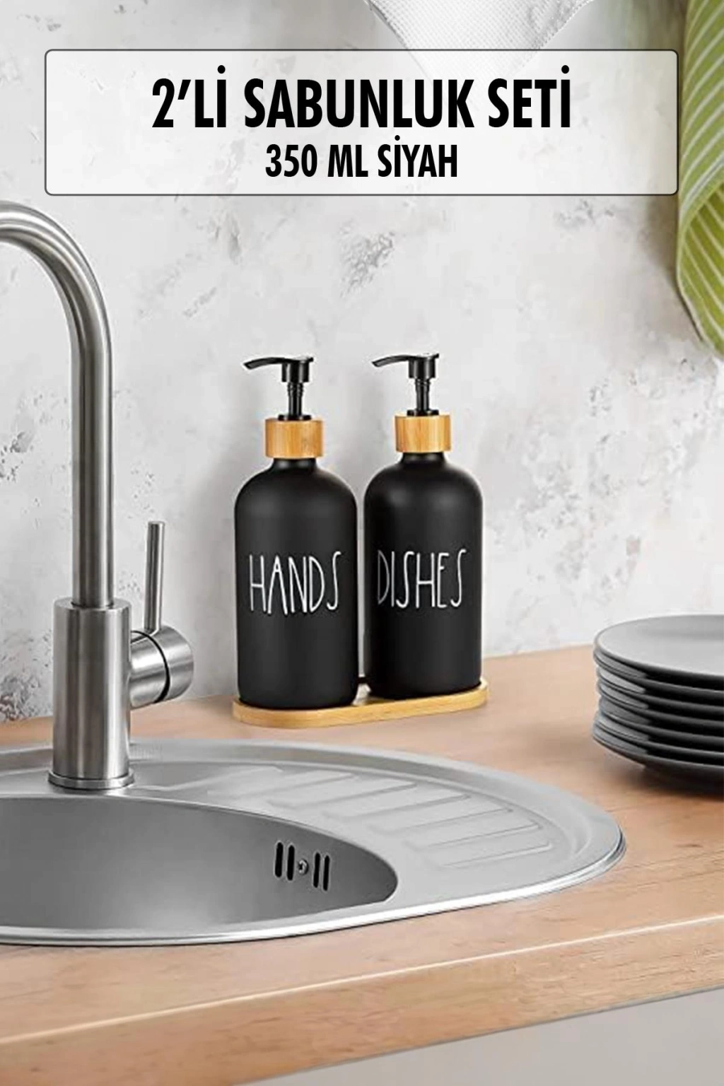 2 Li Bambu Altlıklı Sıvı Sabunluk Seti Siyah