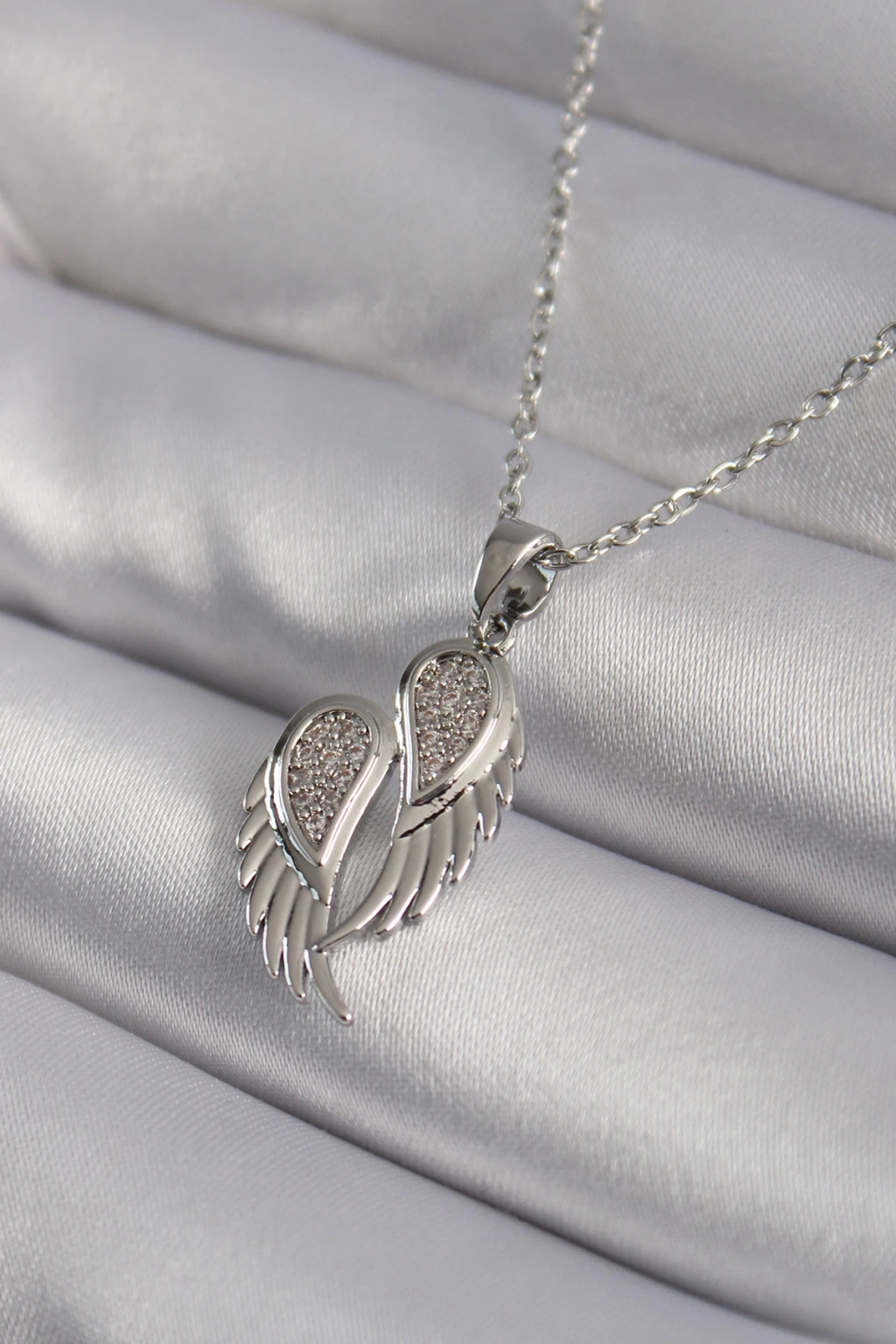 316L Çelik Gümüş Renk Zirkon Taşlı Kanat Model Kadın Kolye