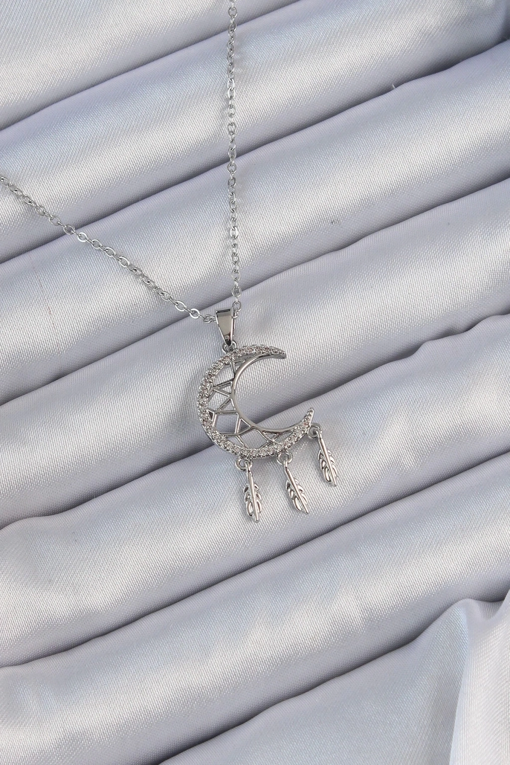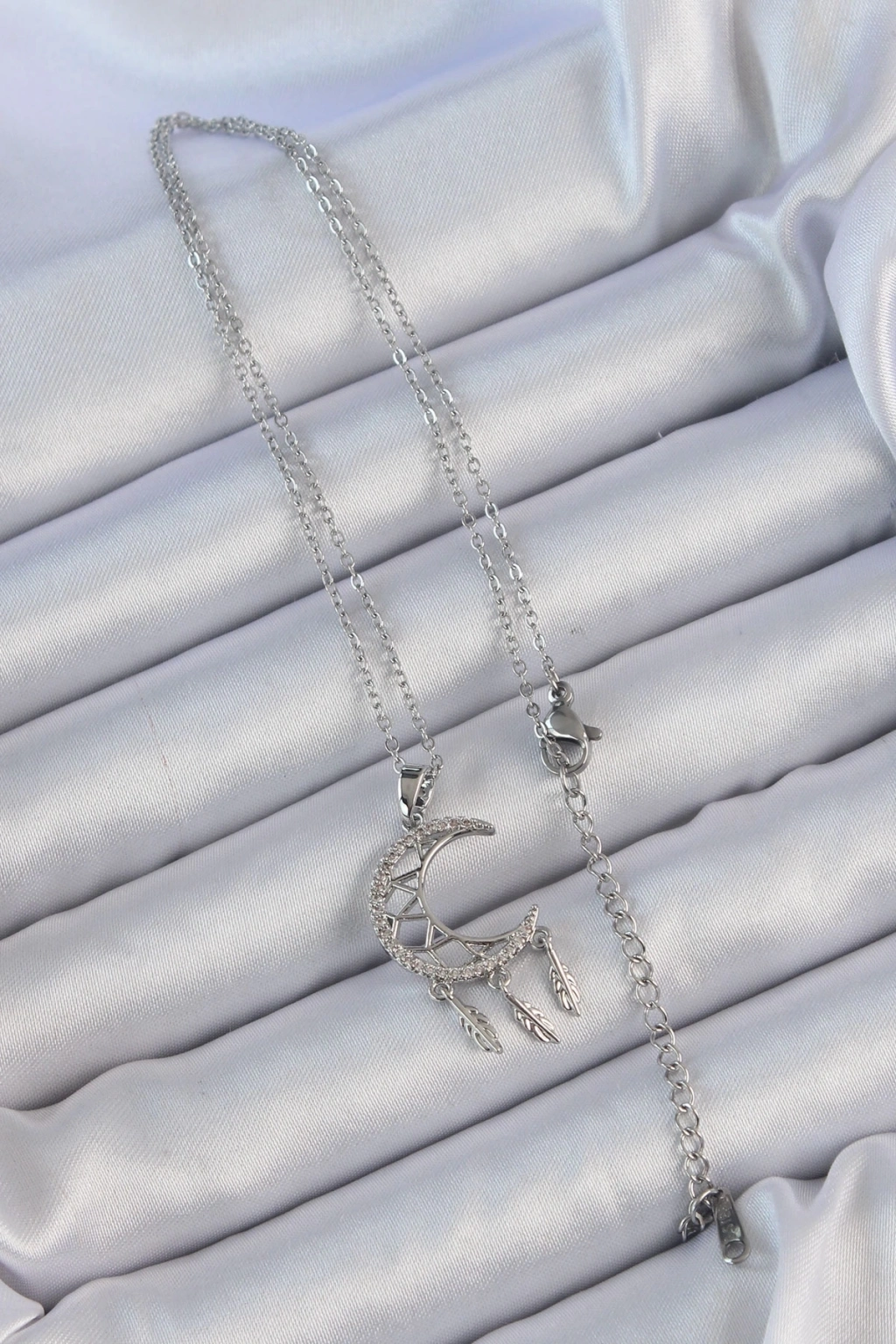 316L Çelik Zincir Gümüş Renk İşlemeli Zirkon Taşlı Ay Kolye