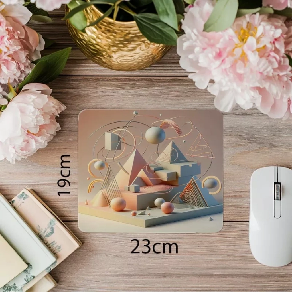 3D piramit ve çember motifleriyle hazırlanan bu mousepad, geometrik estetiği derinlik algısıyla birleştirir. Modern, simetrik ve dikkat çekici tasarımıyla hem ofis hem de oyun alanlarında stil sahibi bir atmosfer sunar.