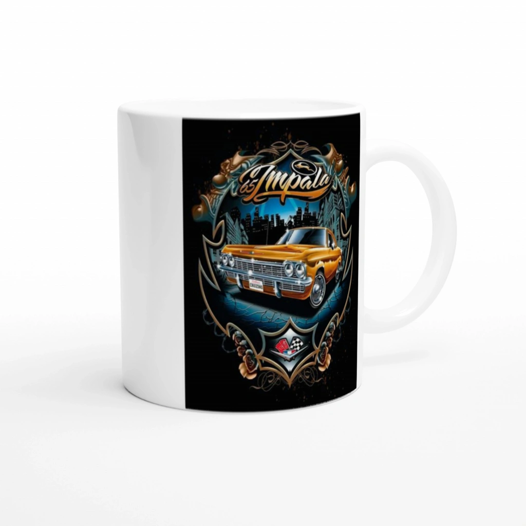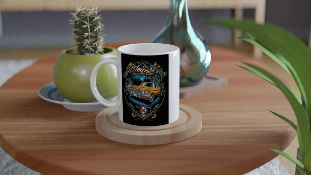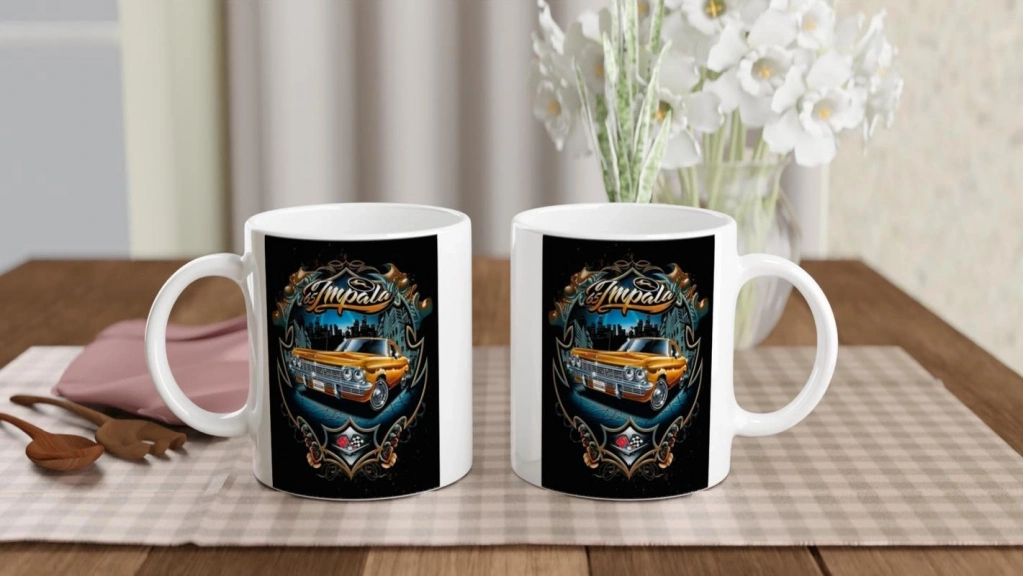 Karanlık fon üzerindeki neon detaylar ve gösterişli araba tasarımıyla dikkat çeken bu Impala baskılı kupa bardak, koleksiyon değeri taşıyan özel bir tasarımdır.