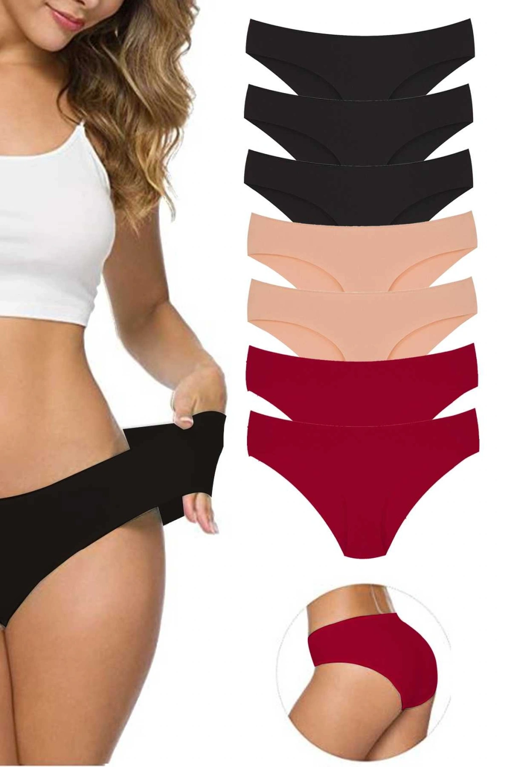 7 Adet Kadın Dikişsiz Lazer Kesim Esnek İz yapmayan Külot Siyah Ten Bordo