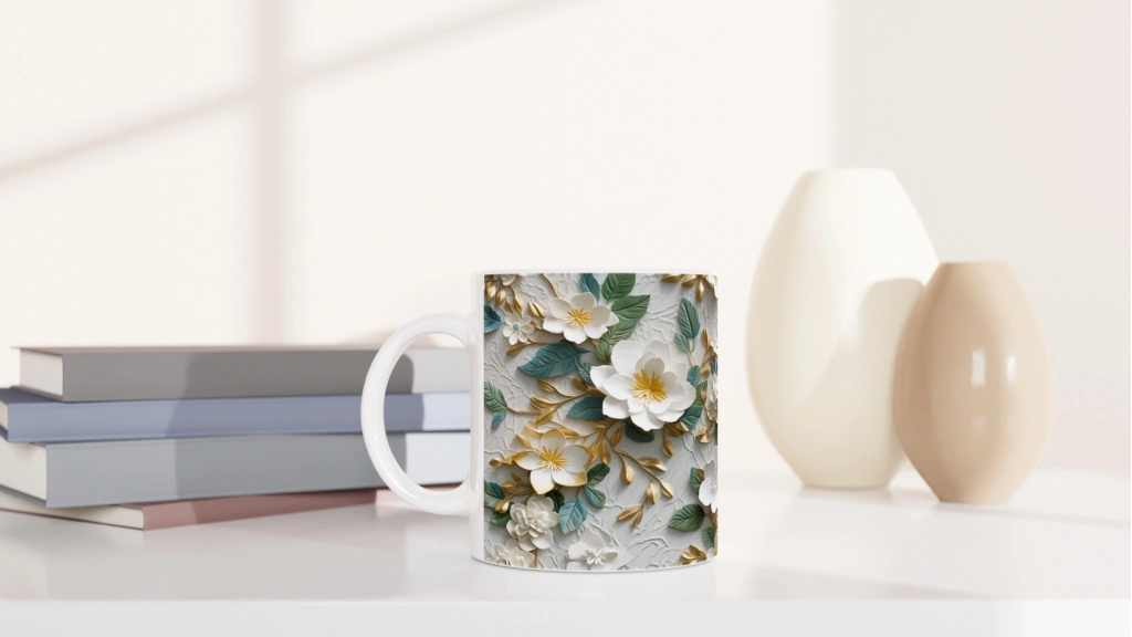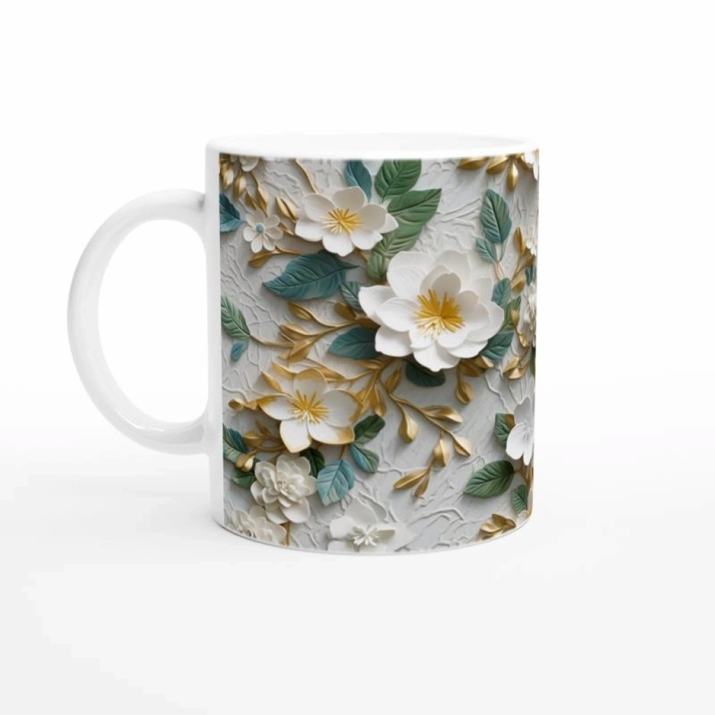 Altın ve Yeşil Yapraklı Beyaz Çiçek Desenli Kupa Bardak