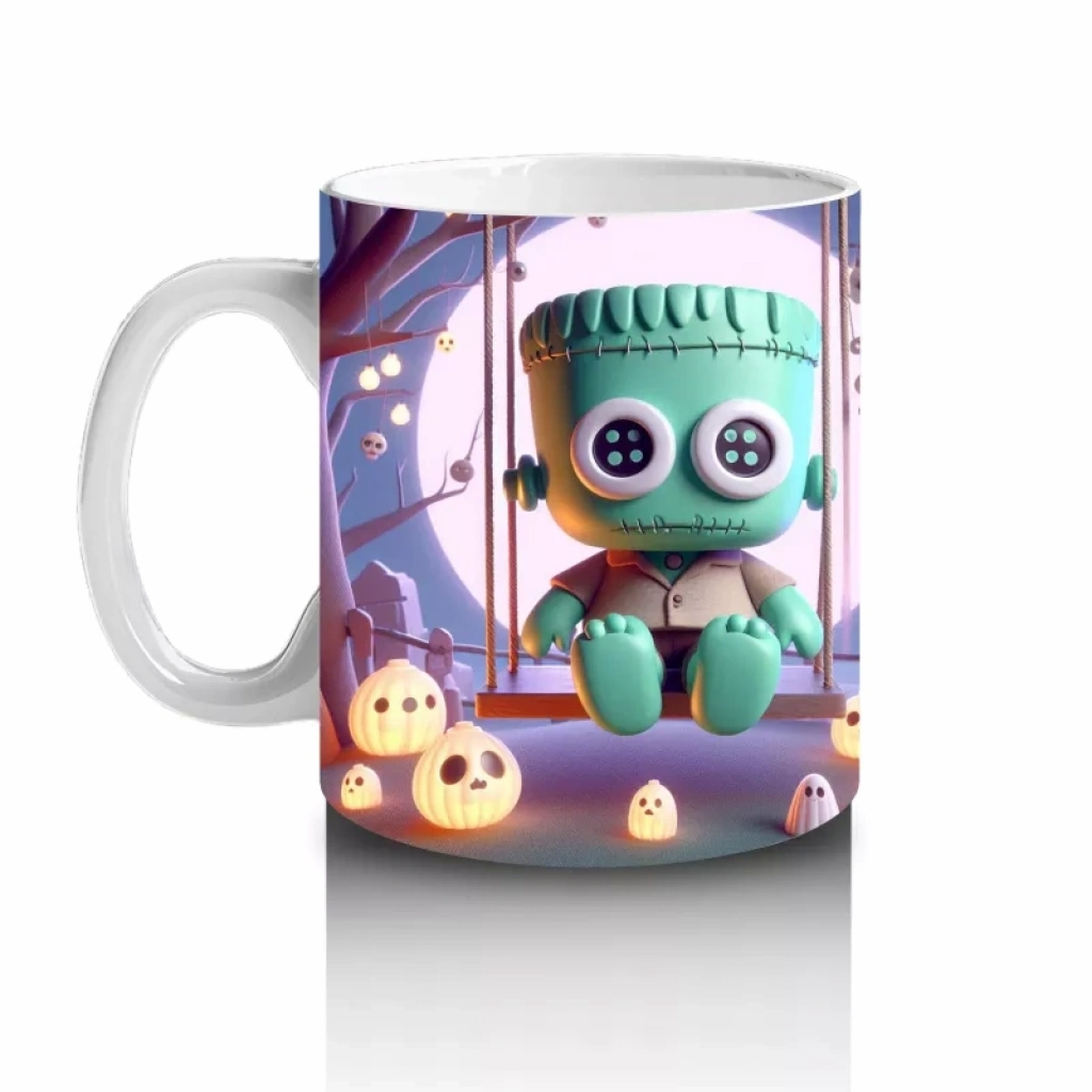 Ay ışığında şeker sepeti taşıyan zombi çocuk figürüyle hazırlanan bu eğlenceli kupa bardak, Cadılar Bayramı’na hem korku hem de neşe katar.