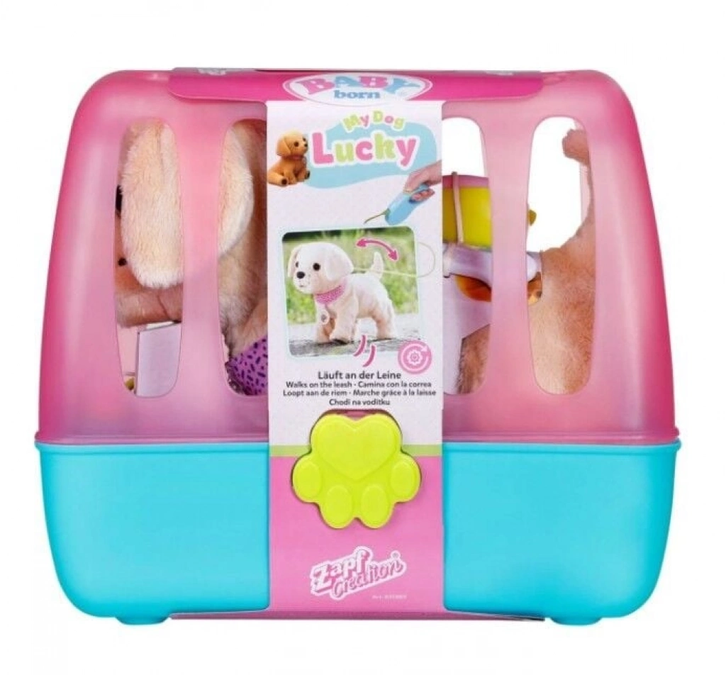 Köpeğim Lucky ile tanış! Baby Born çizgi filminden tanıdığımız Köpeğim Lucky, tasmayla yürüyebiliyor, kokluyor, kuyruğunu sallıyor, kabından gerçek su içiyor ve bacağını kaldırıp tuvaletini yapıyor! Köpeğim Lucky, şık taşıma çantası, su kabı, kemiği ve tasmasıyla geliyor. Kuyruğunu sallayışını görmek için sırtını okşa, çiğneme seslerini duymak için kemiği ağzına yaklaştır. Hadi sen de Köpeğim Lucky ile eğlenceli maceralara atıl! Baby Born Köpeğim Lucky !