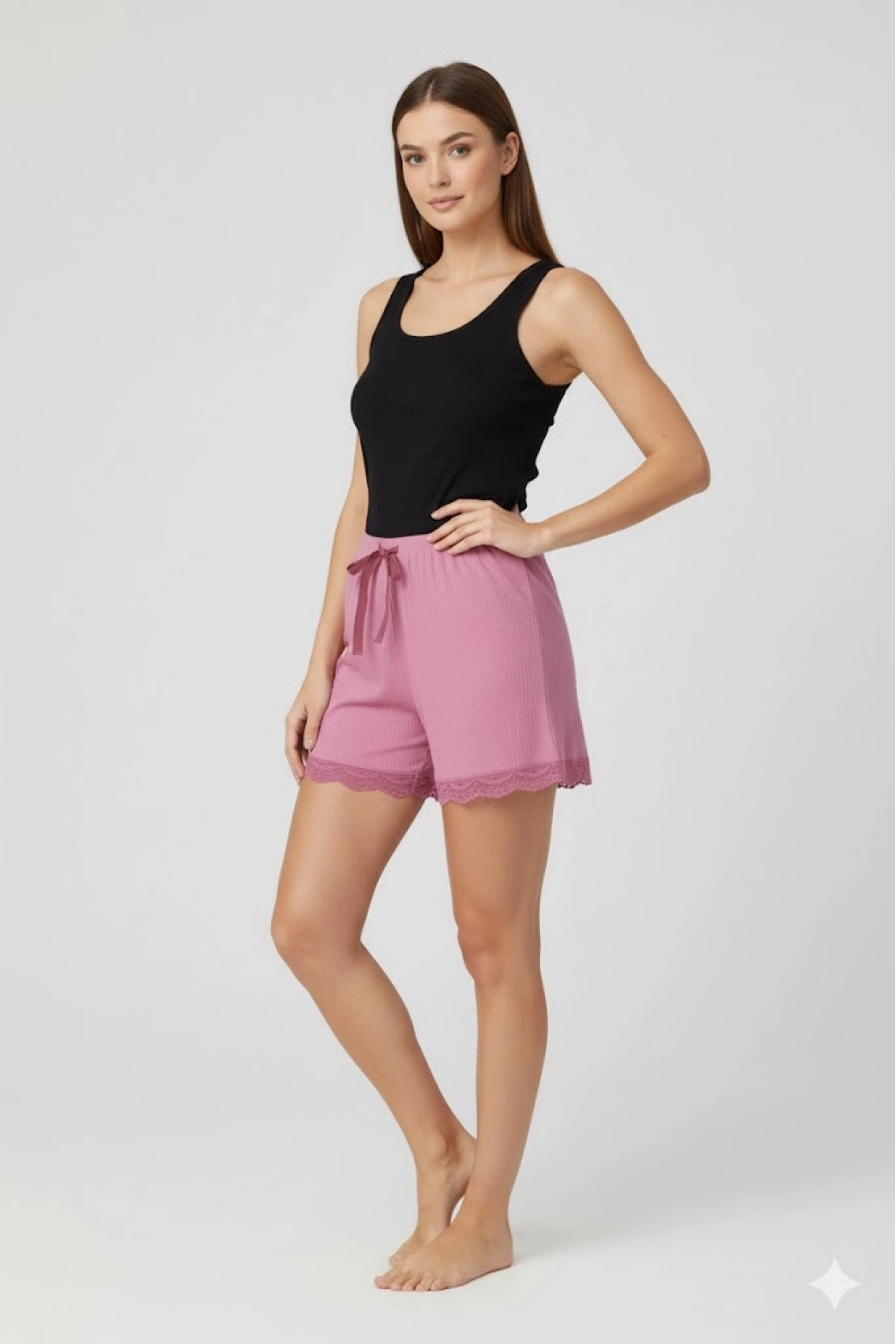 Bambu Fitilli Kadın Ev Şortu Bacak Dantel Detaylı Ev Giyim Pembe