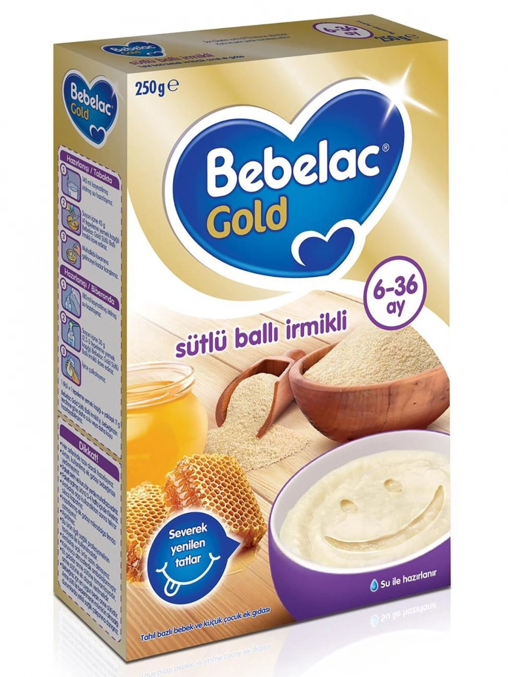 Bebelac Gold Sütlü Ballı İrmikli 6. aydan itibaren kullanımı uygun ek gıdadır.
