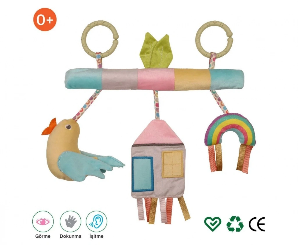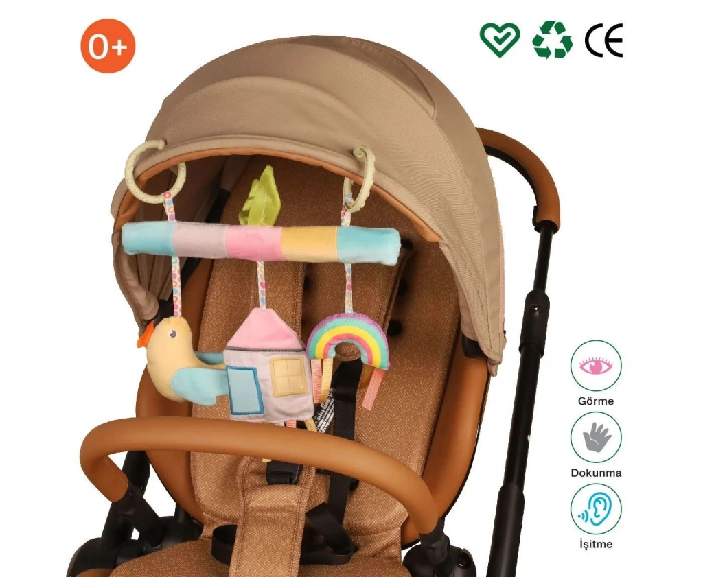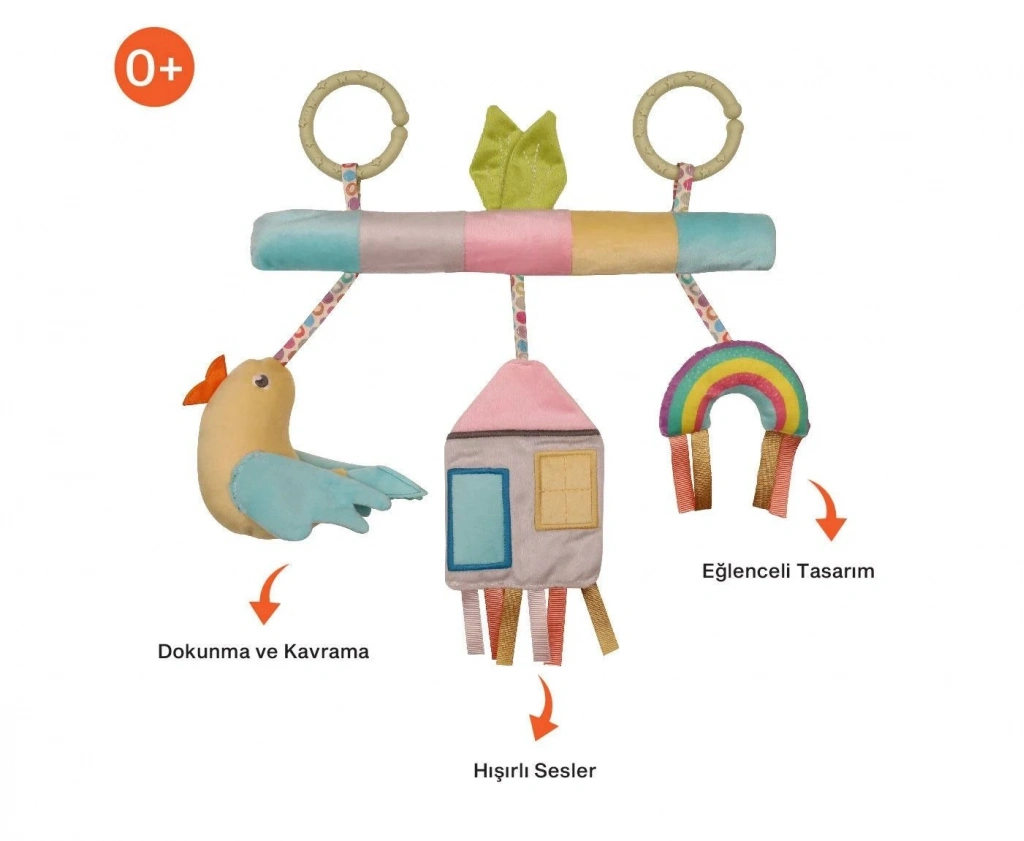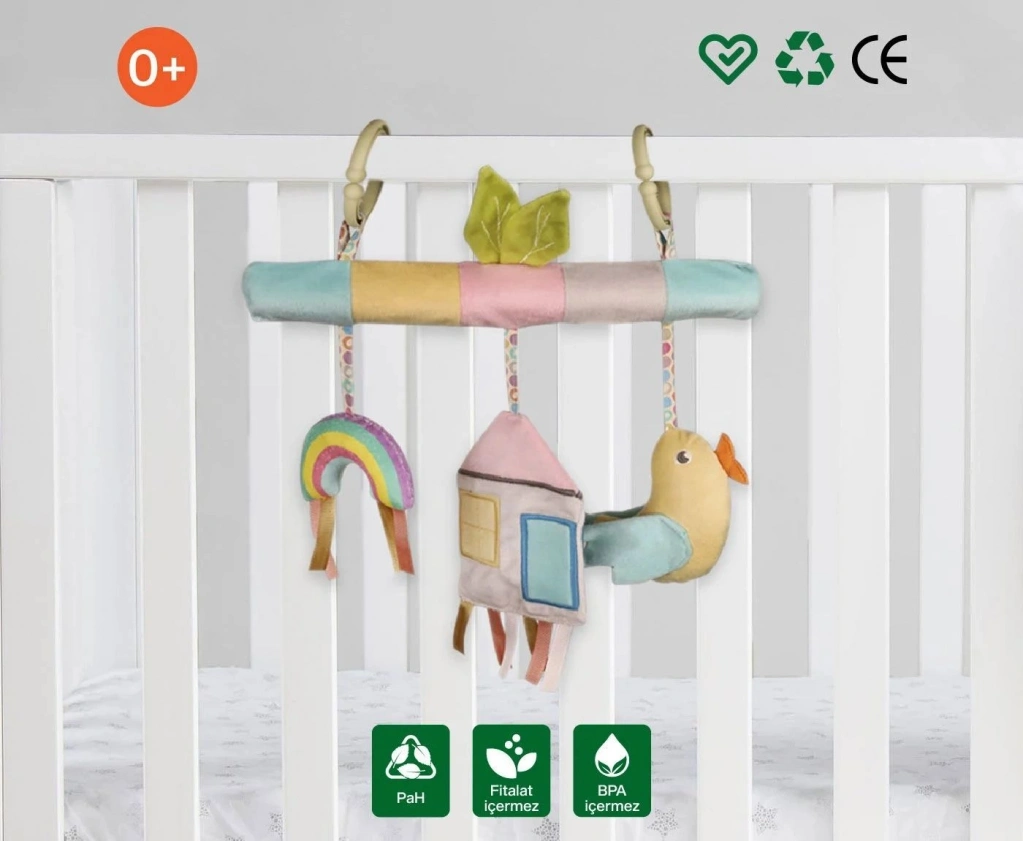 Üzerindeki renkli teması ve farklı şekillerdeki oyuncakları sayesinde bebeklerin parmak kaslarını ve kavrama hareketlerini geliştirir.