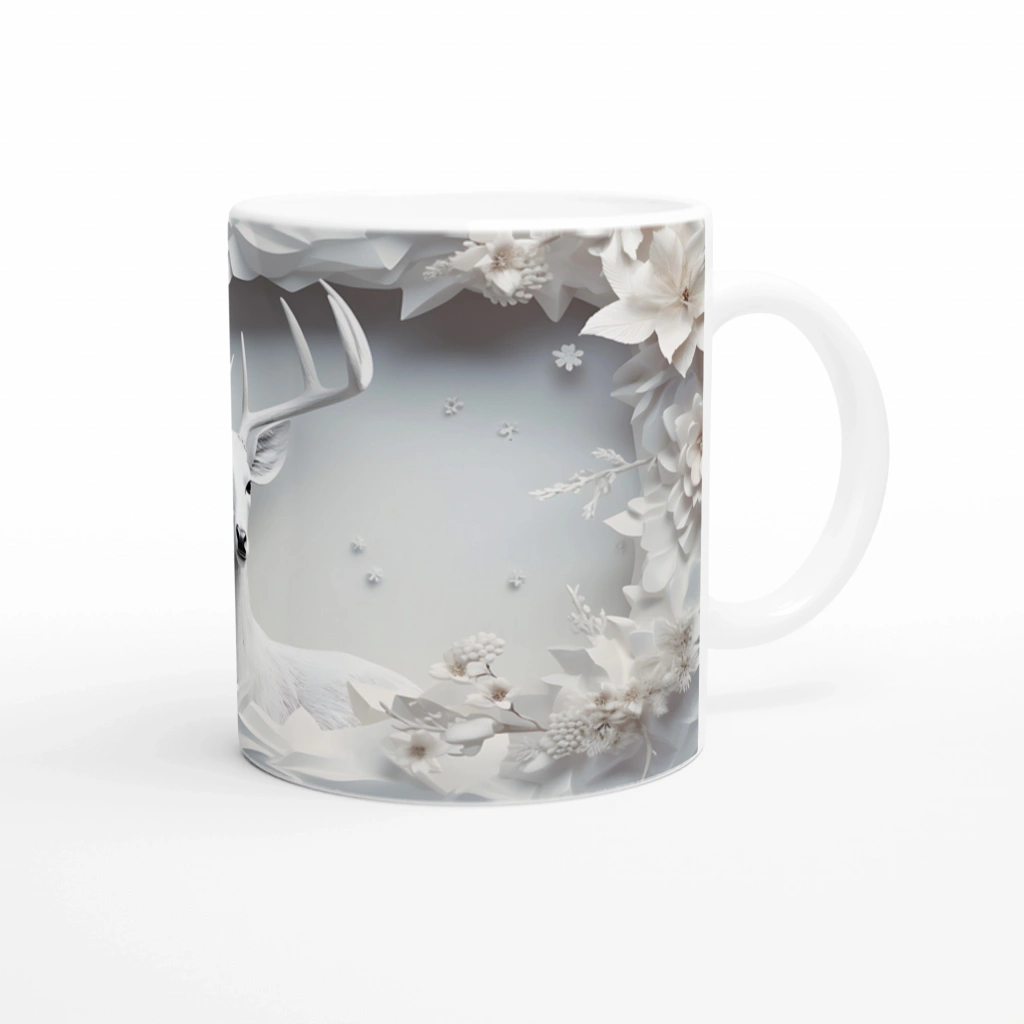 Beyaz Çiçekler Arasında Asil Geyik Desenli Baskılı Kupa Bardak