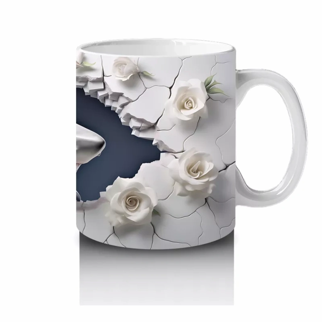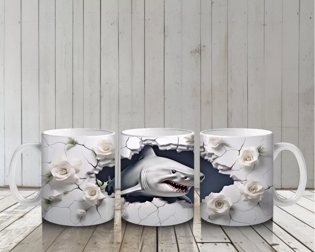 Beyaz çiçeklerin zarafetiyle kontrast oluşturan karanlık gözlü köpek balığı, sürprizli ve ilginç bir kompozisyon sunuyor. Alışılmışın dışında tasarımlardan hoşlananlara özel, çarpıcı bir kupa tasarımı.