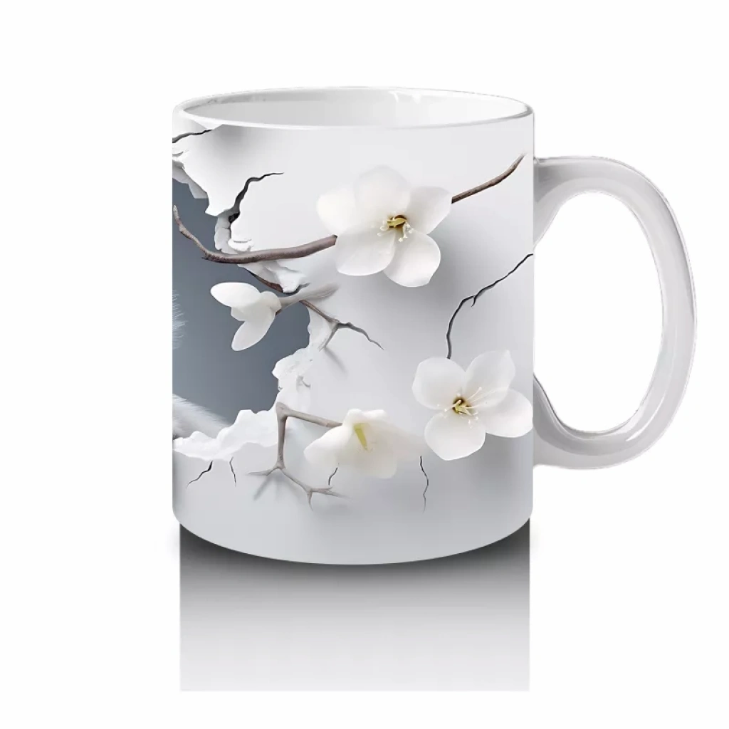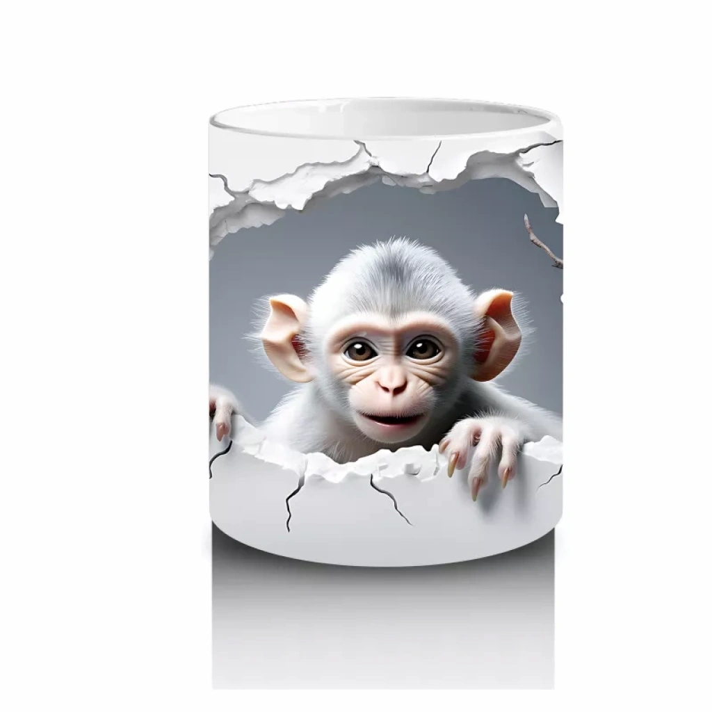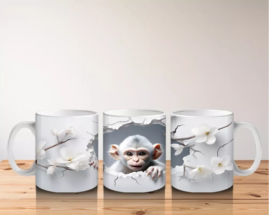 Beyaz Çiçekler Arasında Meraklı Maymun Figürü – Baskılı Kahve Kupası