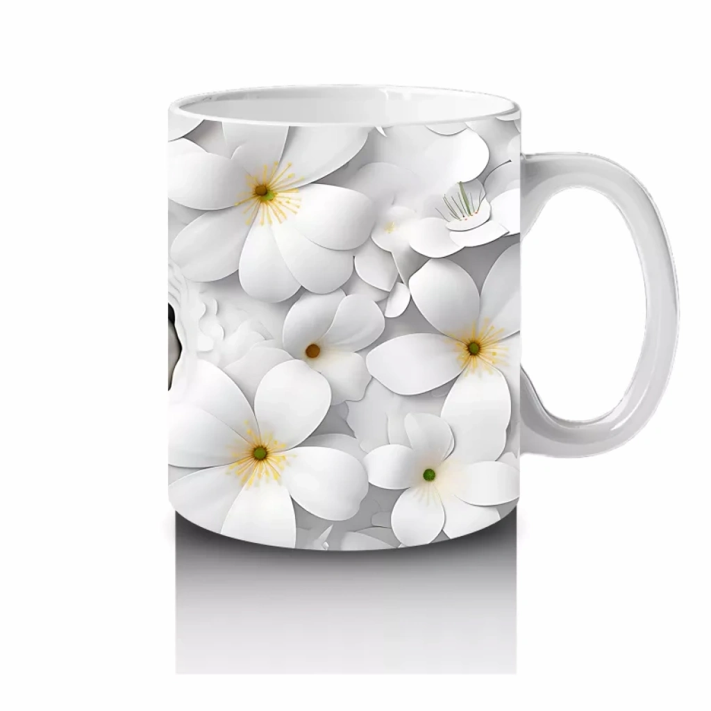 Beyaz Çiçekler Arasında Saklanan Sevimli Yüz Figürü – Baskılı Kahve Kupası