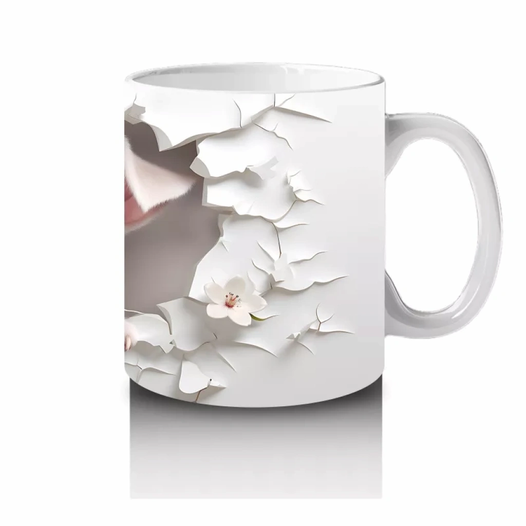 Beyaz çiçeklerin arasında masumiyetle duran yavru köpek, yumuşak ve huzur dolu bir atmosfer yaratıyor. Sevimli ve içten detayları sevenler için ideal bir kupa.