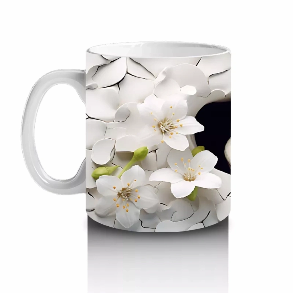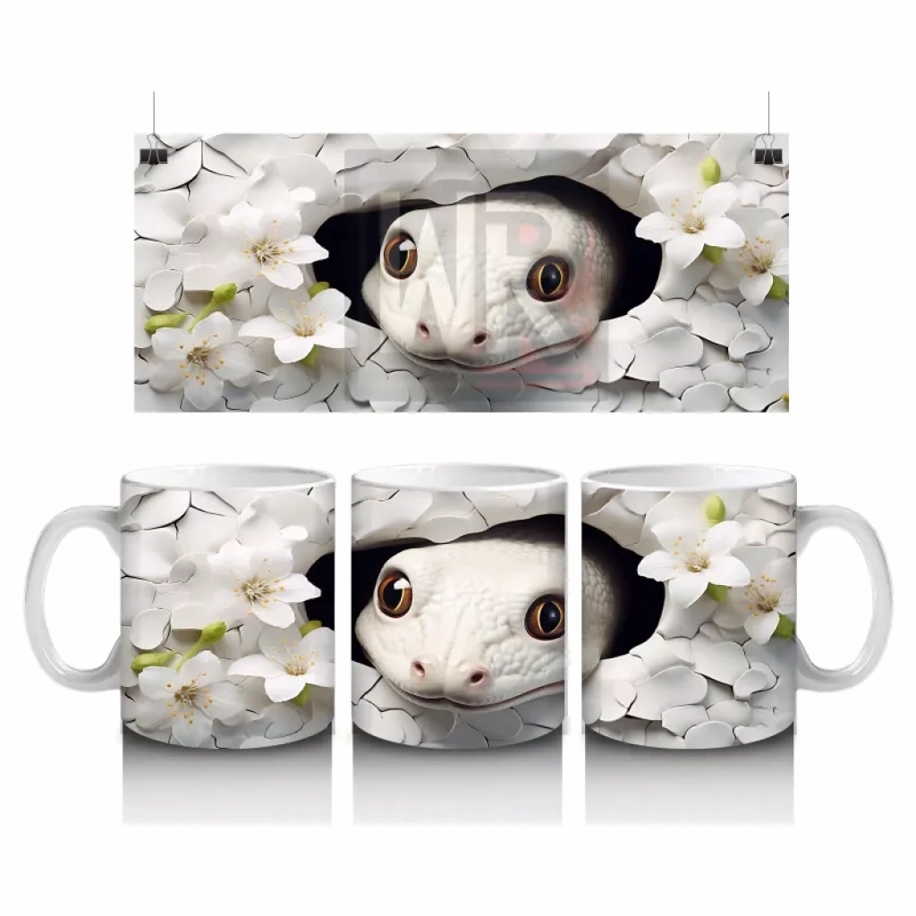 Beyaz Çiçekler Arasında Yumuşak Bakışlı Sürüngen Figürü – Baskılı Kahve Kupası