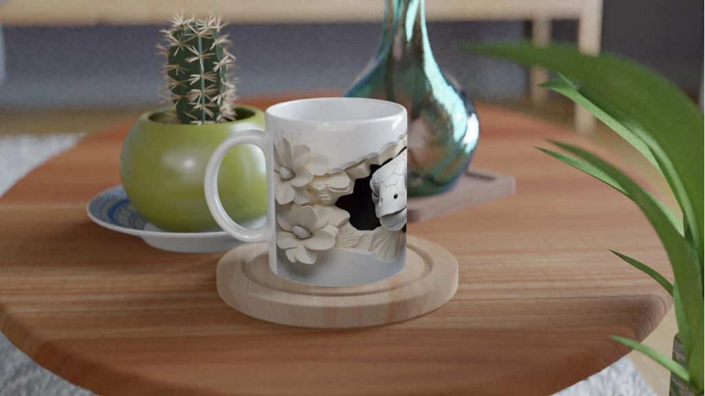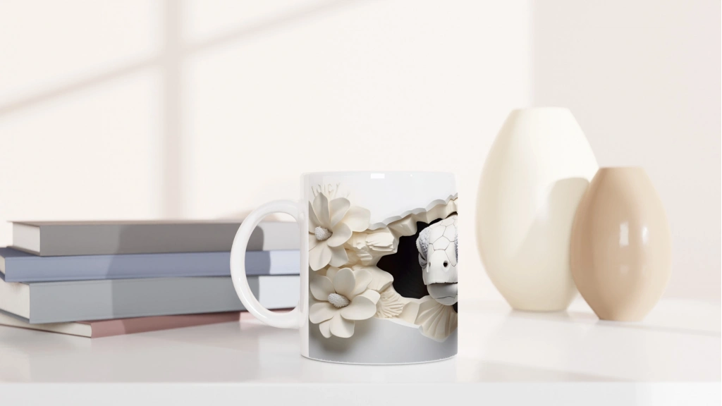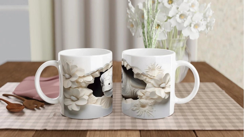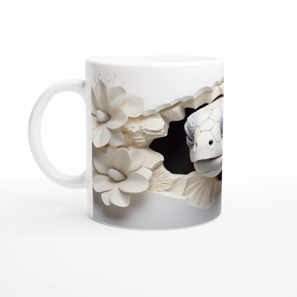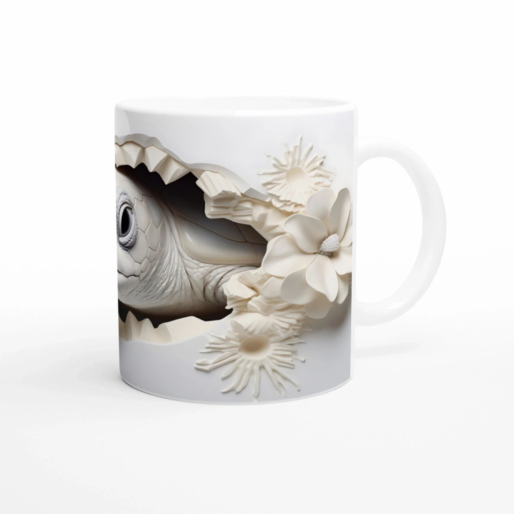 Beyaz çiçeklerin arasında nazlı nazlı bakan bir deniz kaplumbağasıyla süslenen bu özel kupa bardak, doğanın huzurunu ve su altının büyüsünü her an yaşatır.
