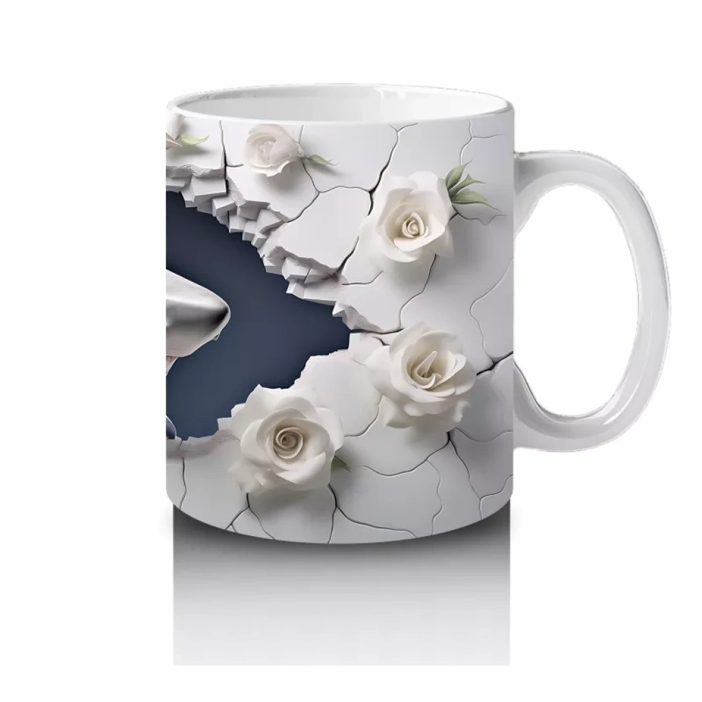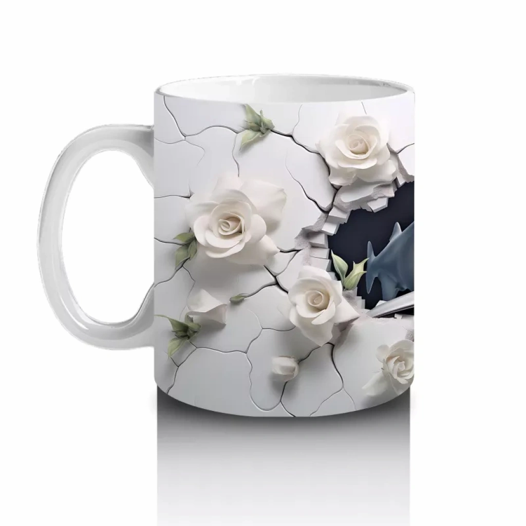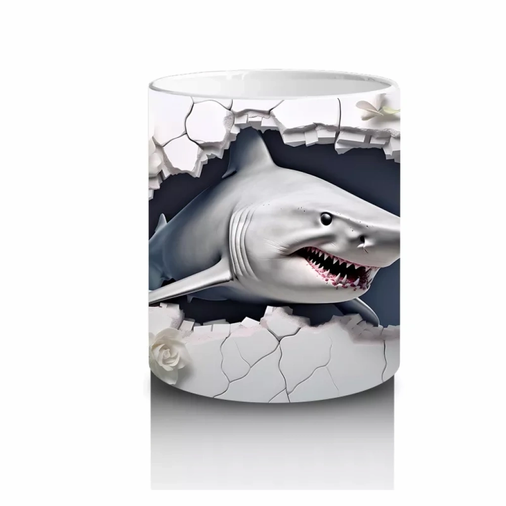 Beyaz çiçeklerle bezenmiş çatlak zeminden bakan köpekbalığı, masumiyet ve güç temalarını harmanlıyor. Zarif ve etkileyici detaylar arayanlar için özel bir kupa.
