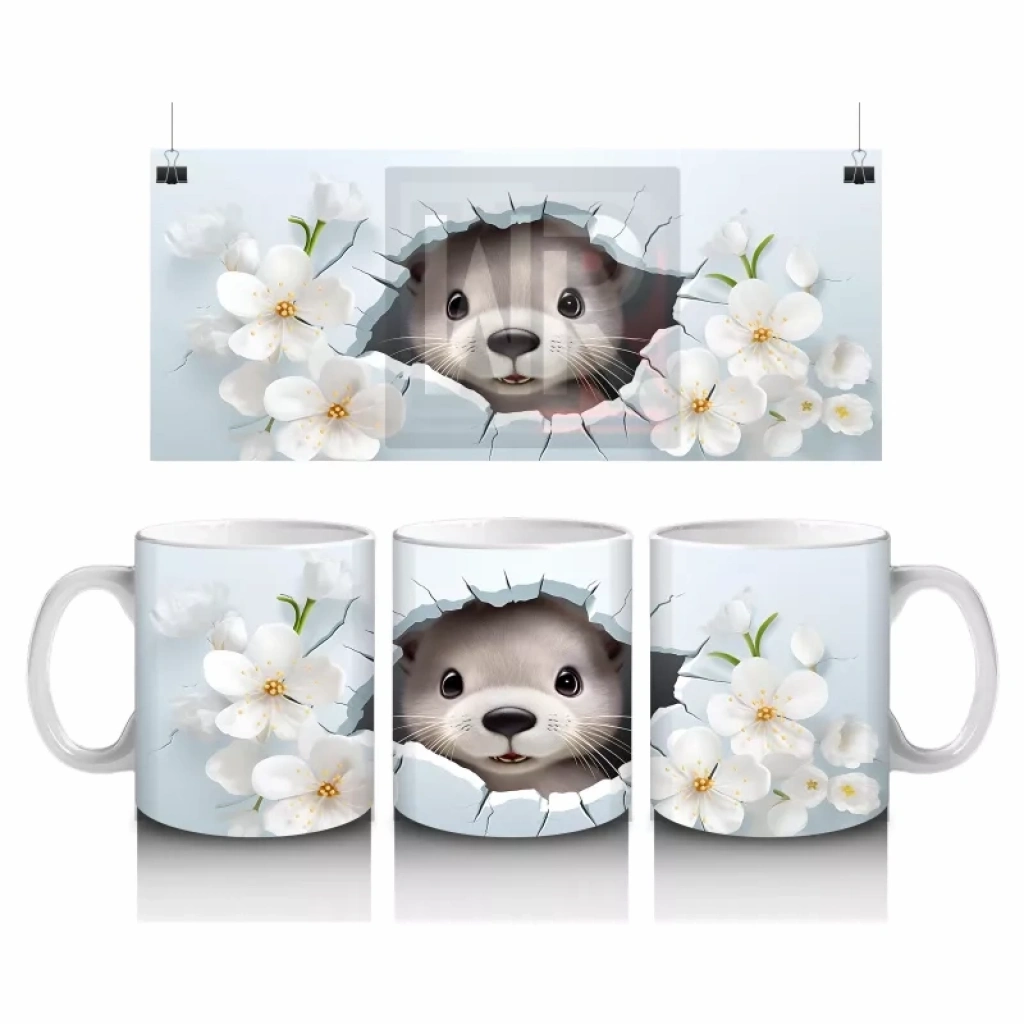 Beyaz Çiçeklerle Süslenmiş Sevimli Su Samuru – Baskılı Kahve Kupası