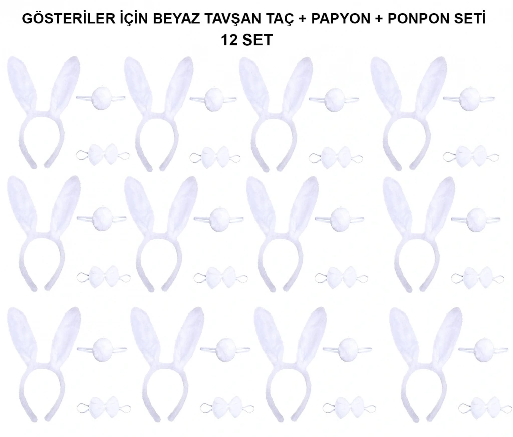 Beyaz Tavşan Kostüm Seti – 12’li Paket (Taç + Papyon + Ponpon)