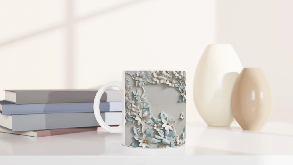 Beyaz Zarafet Çiçekli Kupa Bardak, yumuşak renk geçişleriyle zarif bir atmosfer sunar; minimalist stil sevenler için ideal bir seçimdir.