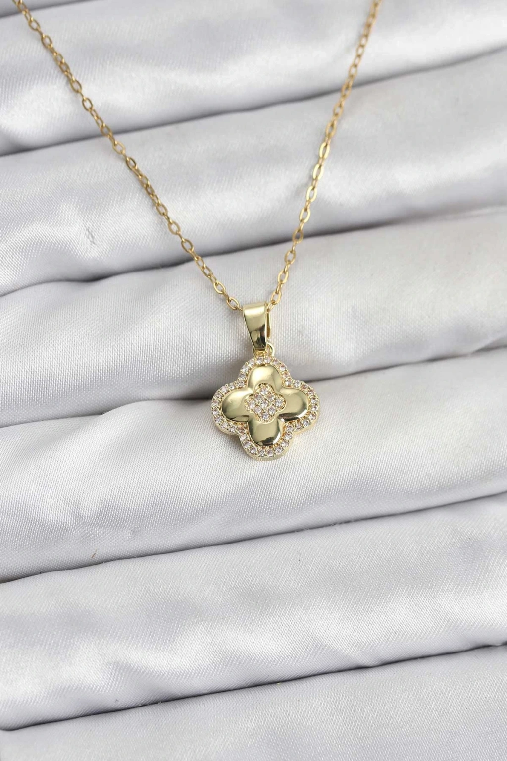 BFS 316L Çelik Zincir Gold Renk Zirkon Taşlı Yonca Model Kadın Kolye