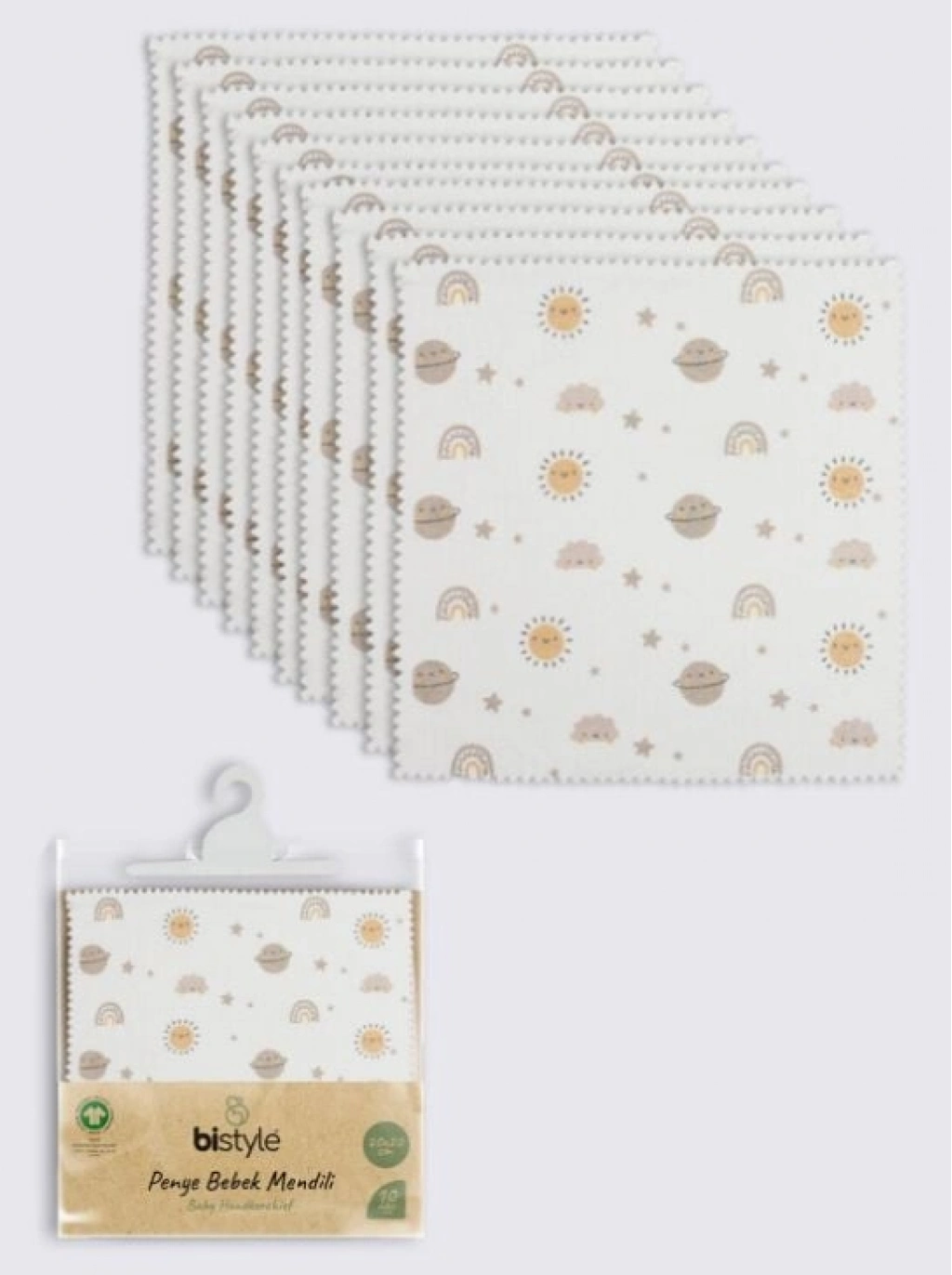 Bistyle Planet 20x20 10'Lu Penye Mendil 90164 Miniklerin hassas ciltleri düşünülerek üretilen Bistyle bebek tekstil ürünleri, yumuşak dokusu ve konforlu yapısı ile gün boyu rahatlık sunar. Nefes alabilir kumaşı sayesinde bebeğinizin cildini nazikçe sarar ve özgürce hareket etmesine destek olur. Uzun süreli kullanım için dayanıklı, kaliteli ve özenle seçilmiş malzemelerden üretilmiştir. Bebeğinizin her anına konfor ve zarafet katmak için ideal bir tercihtir. Yıkama Talimatı: Maksimum 30°C’de hassas programda yıkayınız. Ağartıcı ve optik deterjan kullanmayınız. Benzer renklerle birlikte yıkayınız. Düşük ısıda ütüleyiniz. Tamburlu kurutma önerilmez, sererek kurutunuz. Desen ve kumaş yapısını korumak için tersten yıkama önerilir.