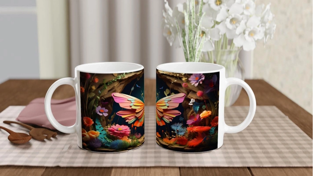 Büyülü Bahçede Uçan Renkli Kelebek Temalı Baskılı Kupa Bardak, masalsı çiçekler ve fantastik atmosferiyle her yudumda içsel bir yolculuk sunuyor. Ruhunu renklendirmek isteyenler için ideal bir hediye!