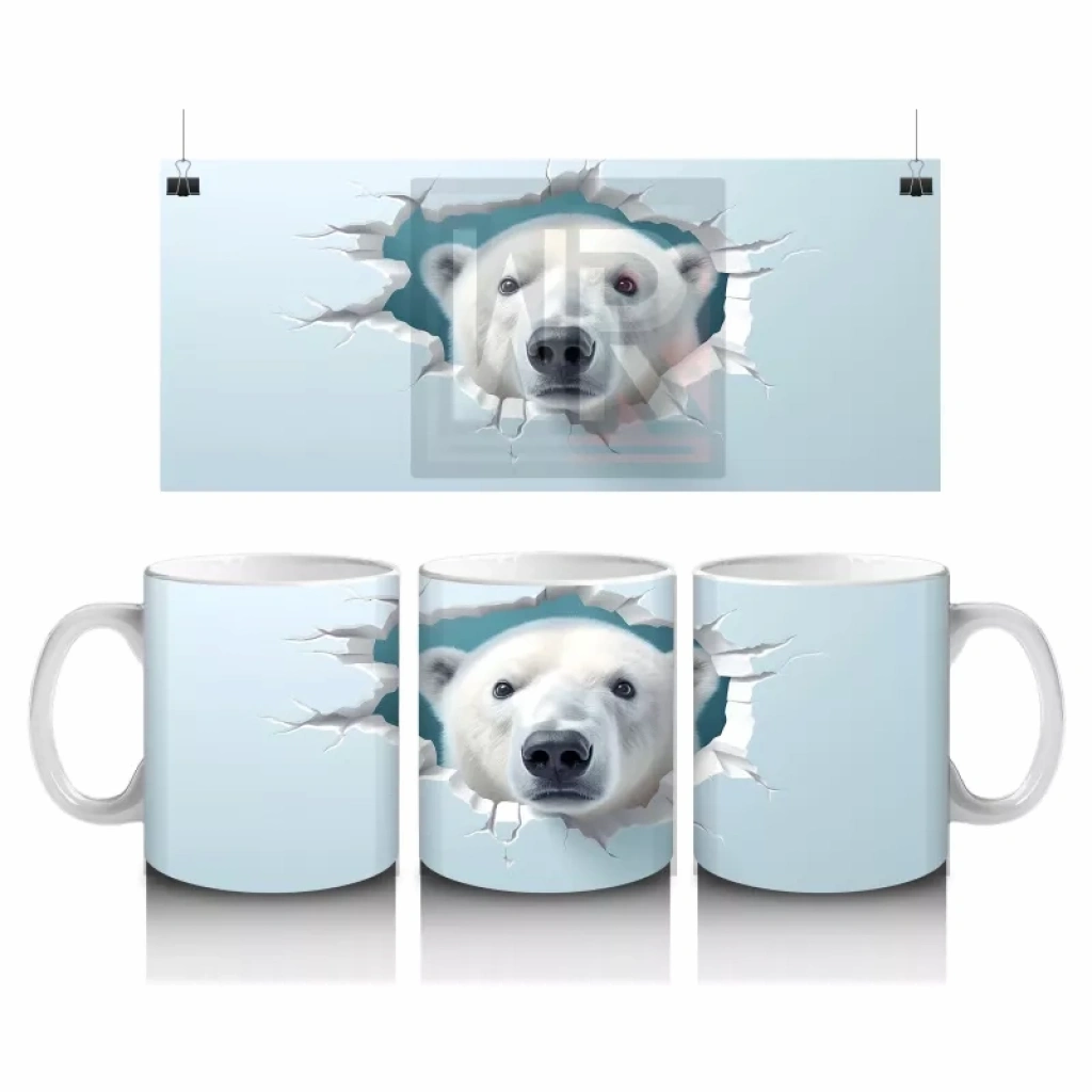 Buz zemin üzerinde duran kutup ayısı figürü, soğuk ve sakin bir atmosfer yaratıyor. Doğa ve vahşi yaşam temalı tasarımlar arayanlar için özel bir kupa.