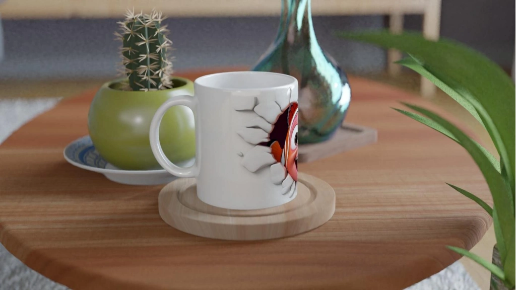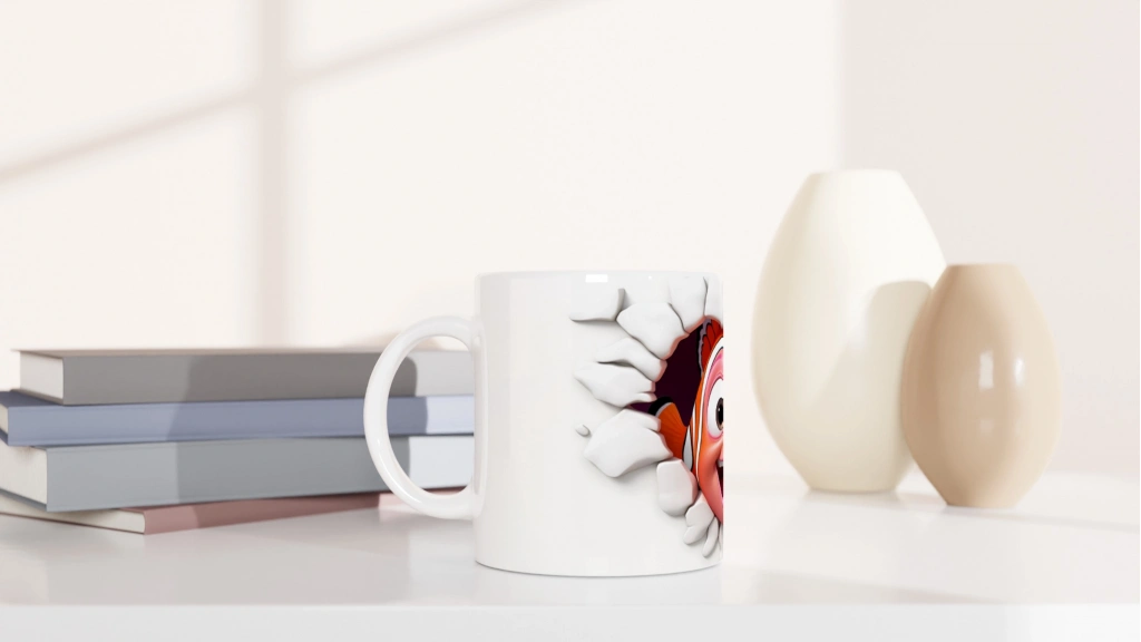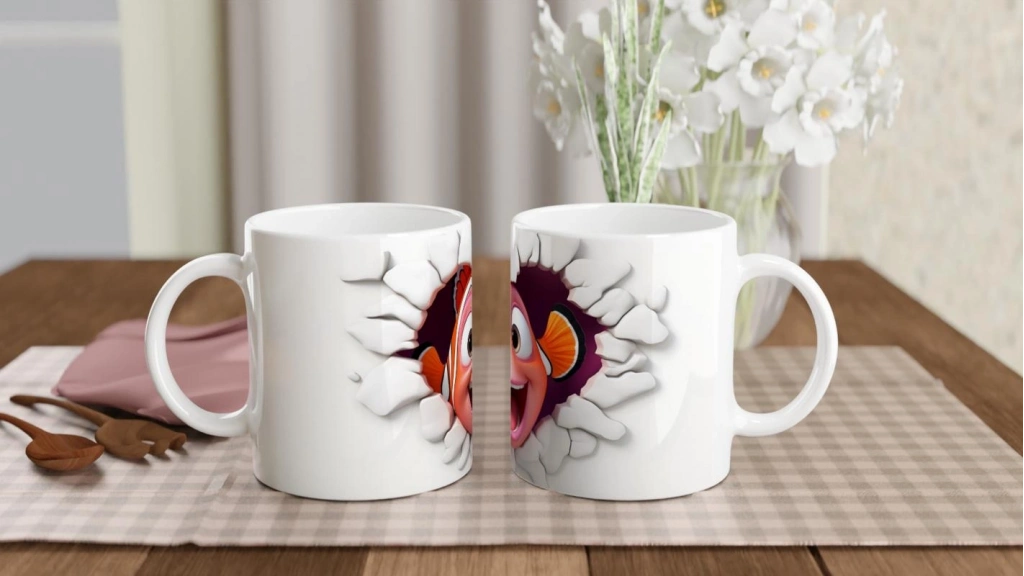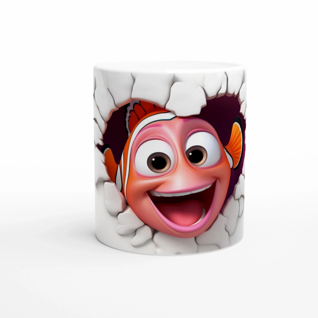 Bembeyaz duvarın içinden fırlayan sevimli bir palyaço balığı, hem sürpriz hem de mutluluk kaynağı! Deniz severlere hitap eden bu tasarım, kupa koleksiyonlarına eğlenceli bir soluk getiriyor.