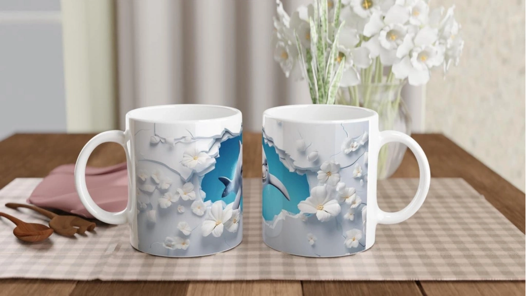 Çatlak Duvardan Bakan Sevimli Yunus Temalı Baskılı Kupa Bardak, beyaz çiçeklerle süslenmiş çatlak duvar efekti ve canlı mavi tonlarıyla pozitif bir atmosfer sunar. Her yudumda deniz esintisini hissettiren, enerji dolu bir tasarım.