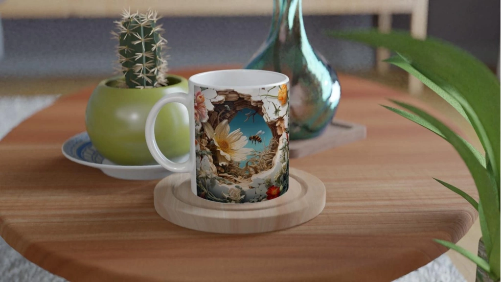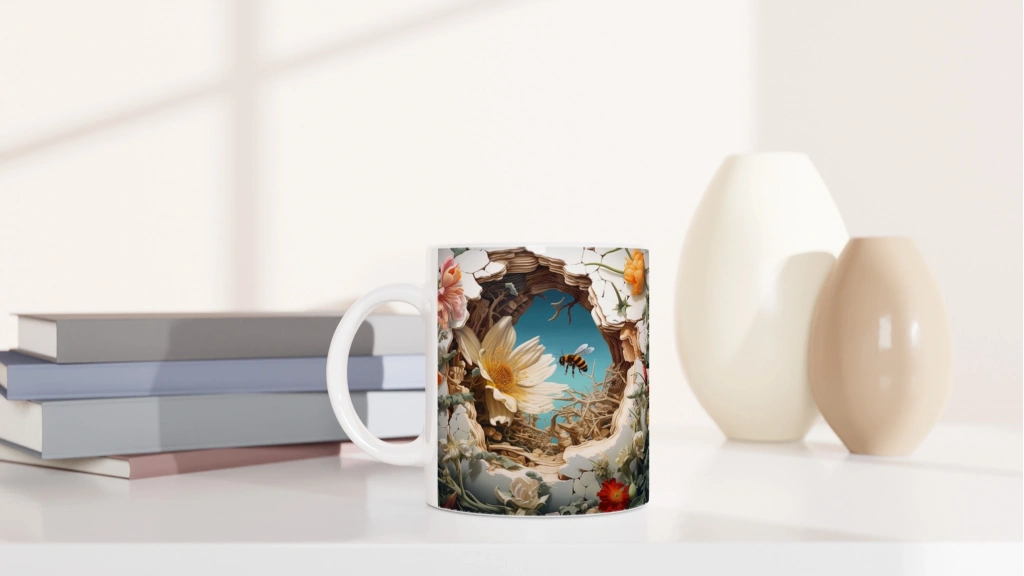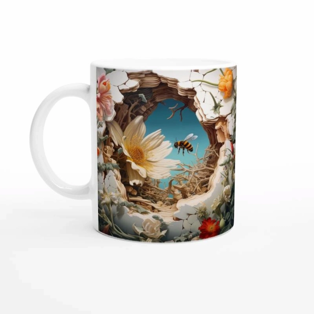 Çatlak Duvardan Uçan Arılar ve Bahar Çiçekleri Temalı Baskılı Kupa Bardak, sarı beyaz papatyalar, kırmızı çiçekler ve mavi gökyüzüyle çevrili detaylı tasarımı sayesinde baharın neşesini her yudumda hissettirir. Doğa tutkunlarına özel, enerjik bir tercih.