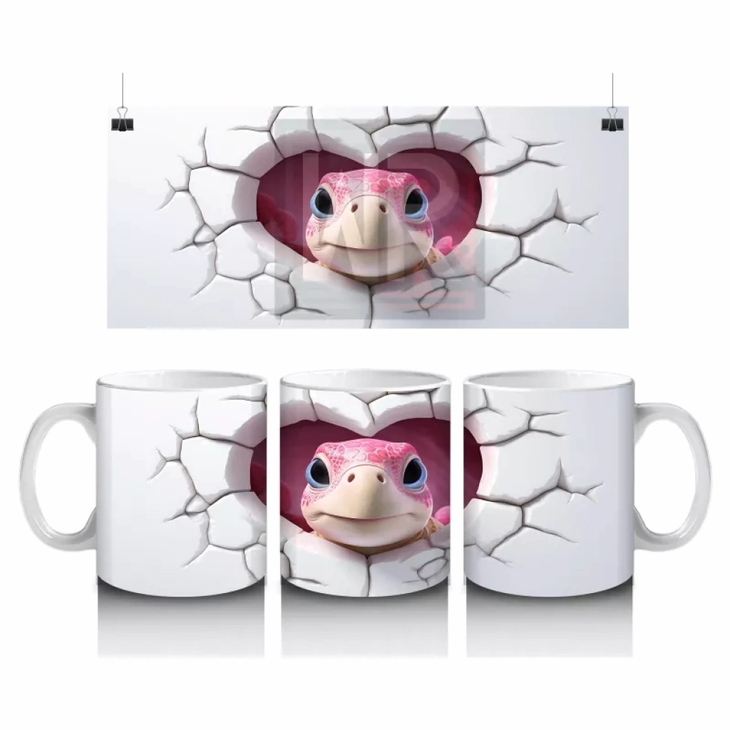 Kalp şeklindeki çatlağın içinden sevimli gözlerle bakan kaplumbağa maskot, sade ama etkileyici bir tasarım sunuyor. Sevimli detaylarla dolu, duygusal ve neşeli bir kupa seçeneği.