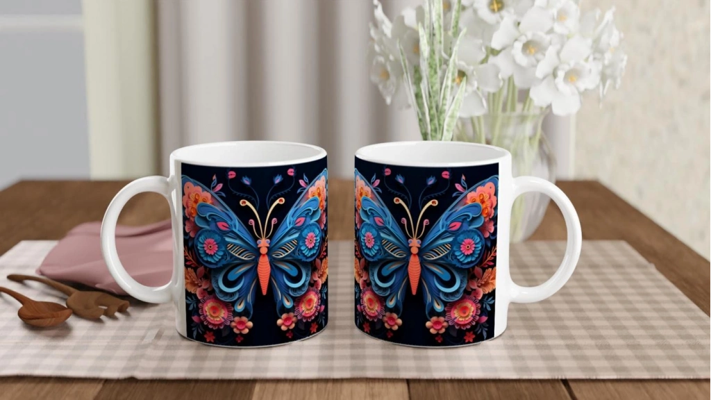 Çiçek Kanatlı Kelebek Baskılı Kupa Bardak, narin bir kelebeğin renkli çiçeklerle harmanlanmış kanatlarından ilham alıyor. Canlı mavi, mercan ve pembenin eşsiz uyumuyla hazırlanan bu tasarım, hem ruhu hem ortamı aydınlatıyor. Şıklığı ve doğa sevgisini bir araya getiren bu kupa, göz alıcı bir hediye seçeneği!