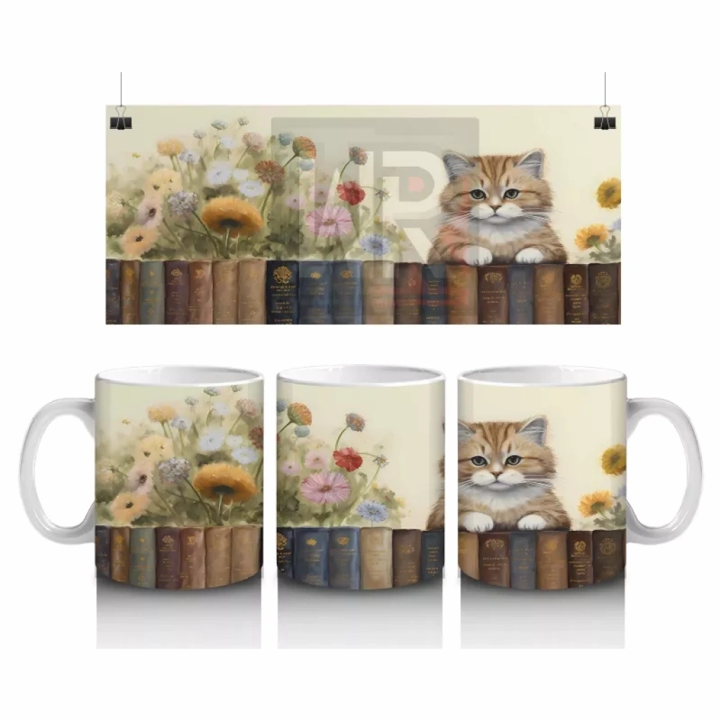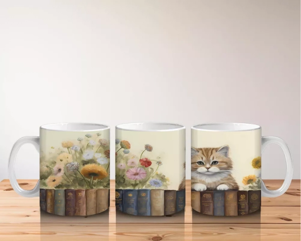 Çiçeklerle çevrili bir kitaplık üzerinde keyifle oturan kedi, sakinliği ve doğa sevgisini bir arada sunuyor. Estetik detaylarla dolu, huzur veren bir kupa alternatifi.
