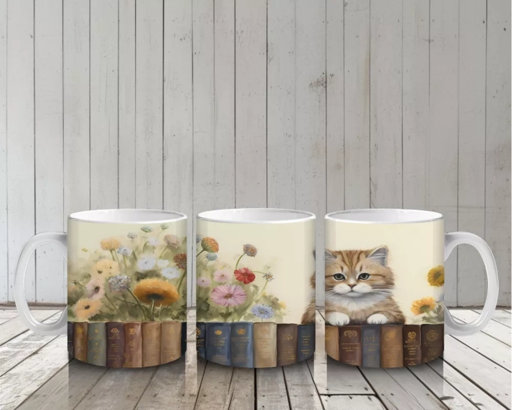 Çiçekler Arasında Kitaplık Üzerine Oturmuş Kedi – Baskılı Kahve Kupası