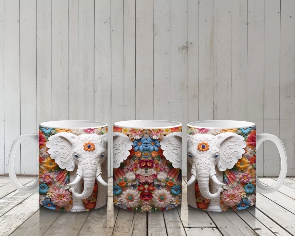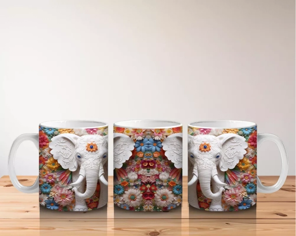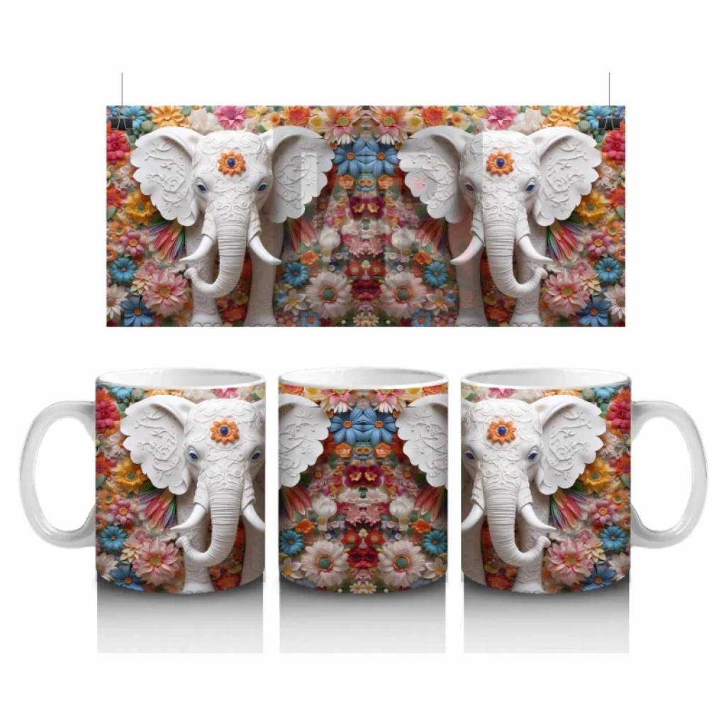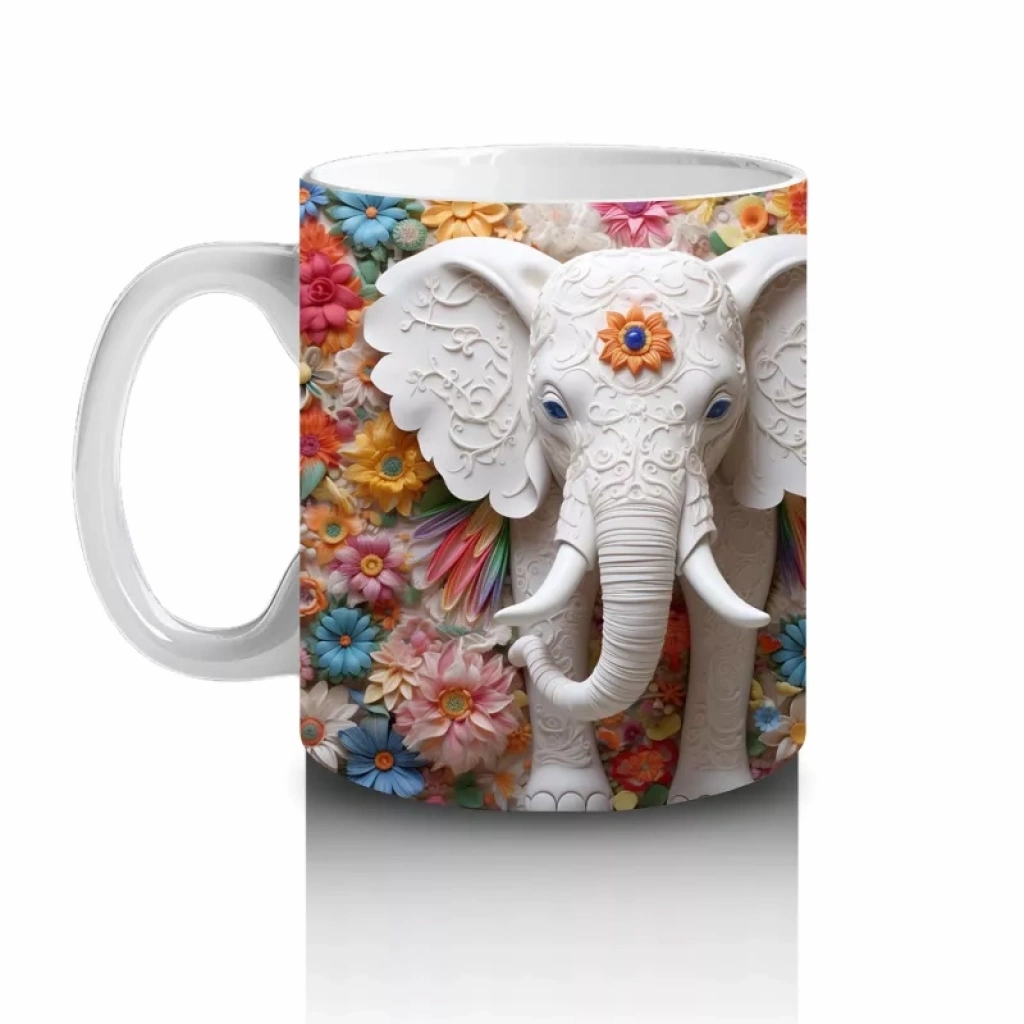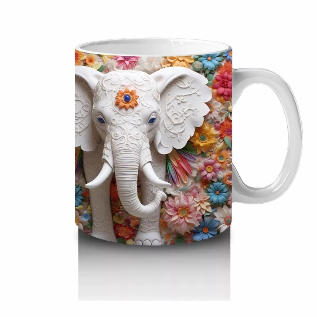 Çiçekli Arka Planda Fildişi Renkli Fil Figürü – Baskılı Kahve Kupası