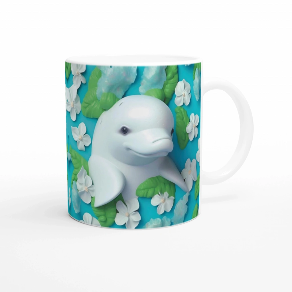 Sevimli beyaz yunus ve zarif çiçeklerle süslenen bu özel kupa bardak, masumiyeti ve