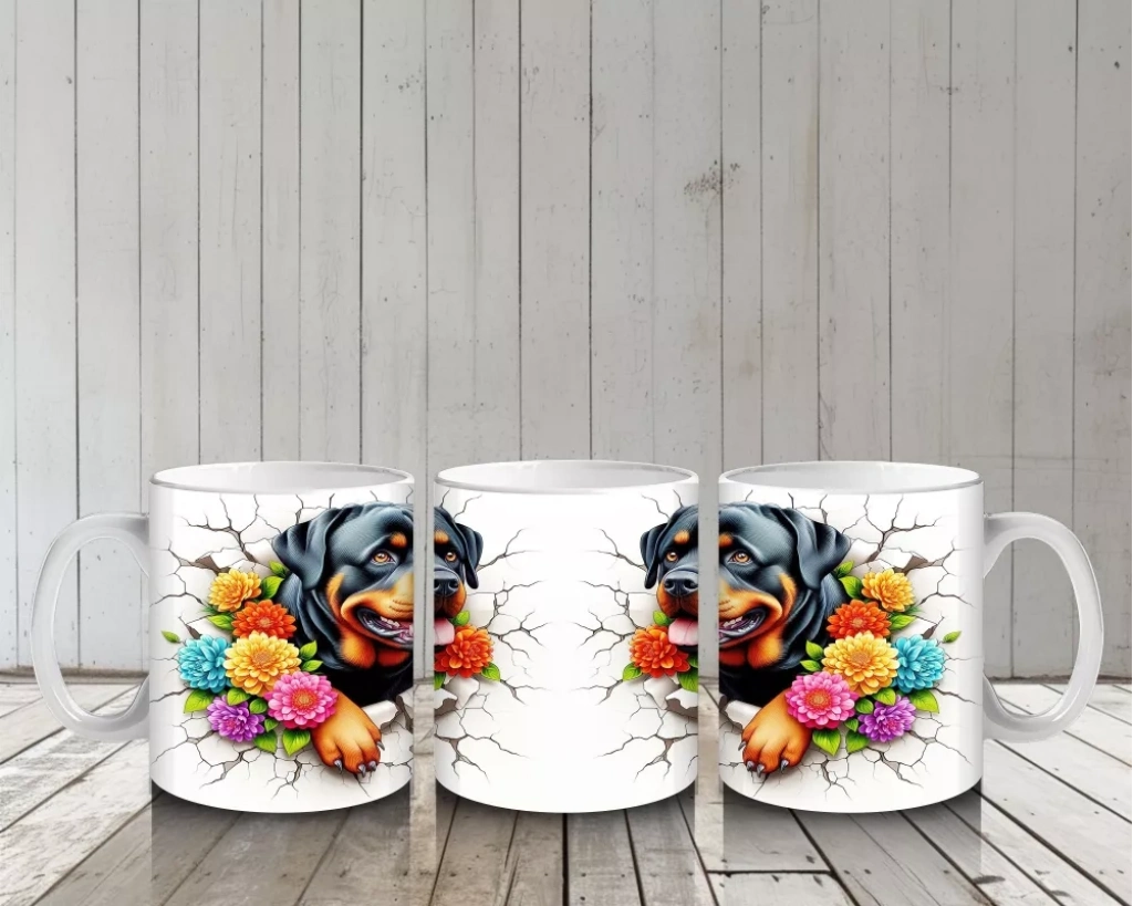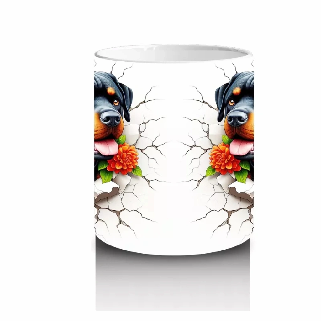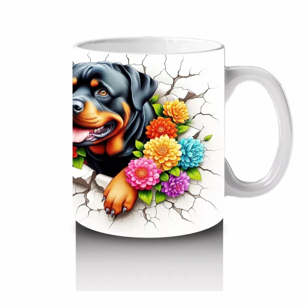 Çiçekli tacıyla neşesini yansıtan bu Rottweiler illüstrasyonu, güçlü duruşun sevimli haliyle buluştuğu enerjik bir tasarım sunuyor. Köpek severler için dikkat çekici ve keyifli bir kupa seçeneği.