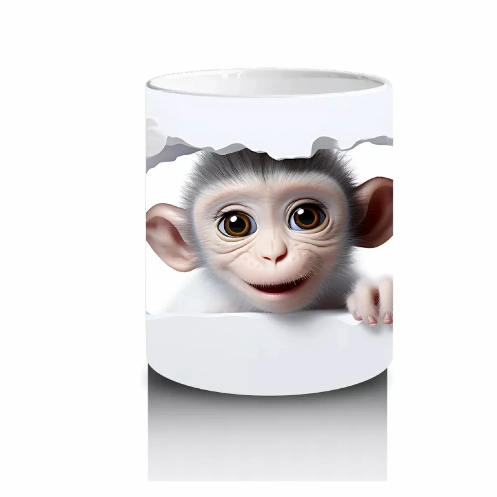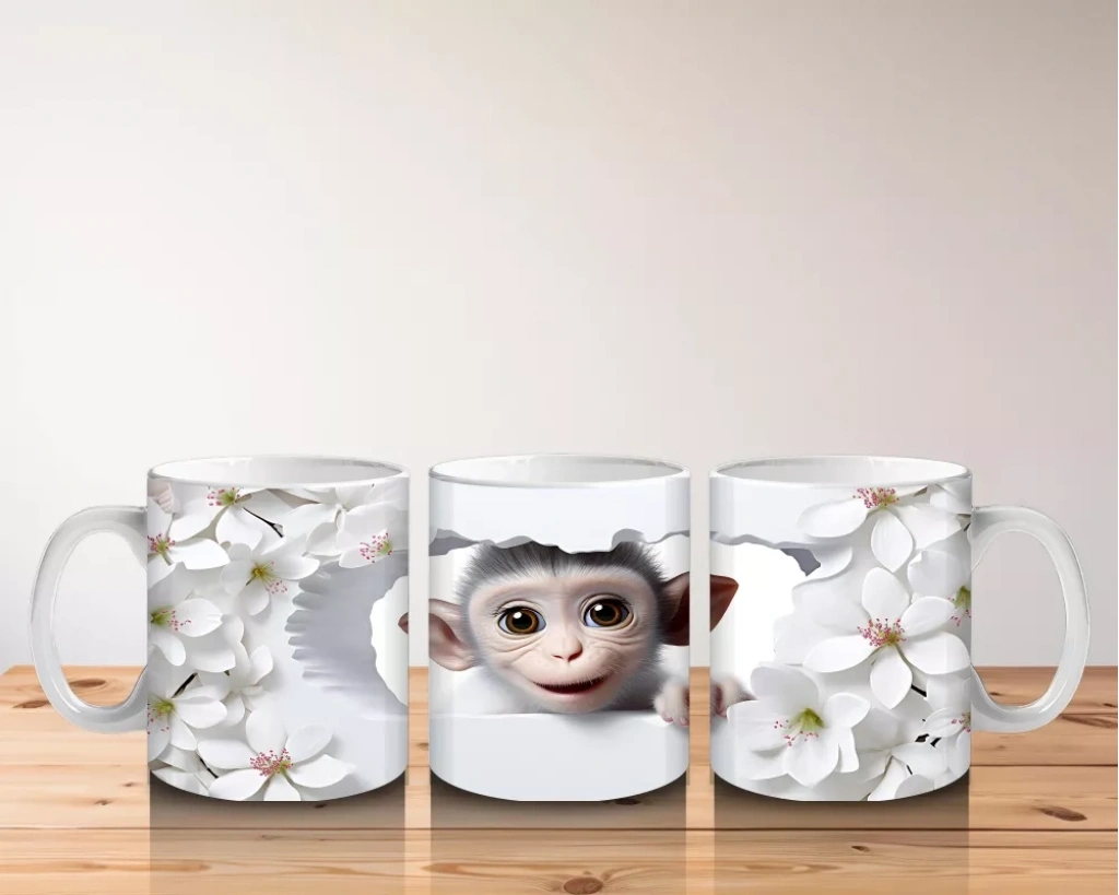 Çiçeklerle dolu zemin üzerinde duran sevimli maymun, neşeli ve samimi bir atmosfer yaratıyor. Doğa ve eğlenceli detayları sevenler için özel bir kupa.