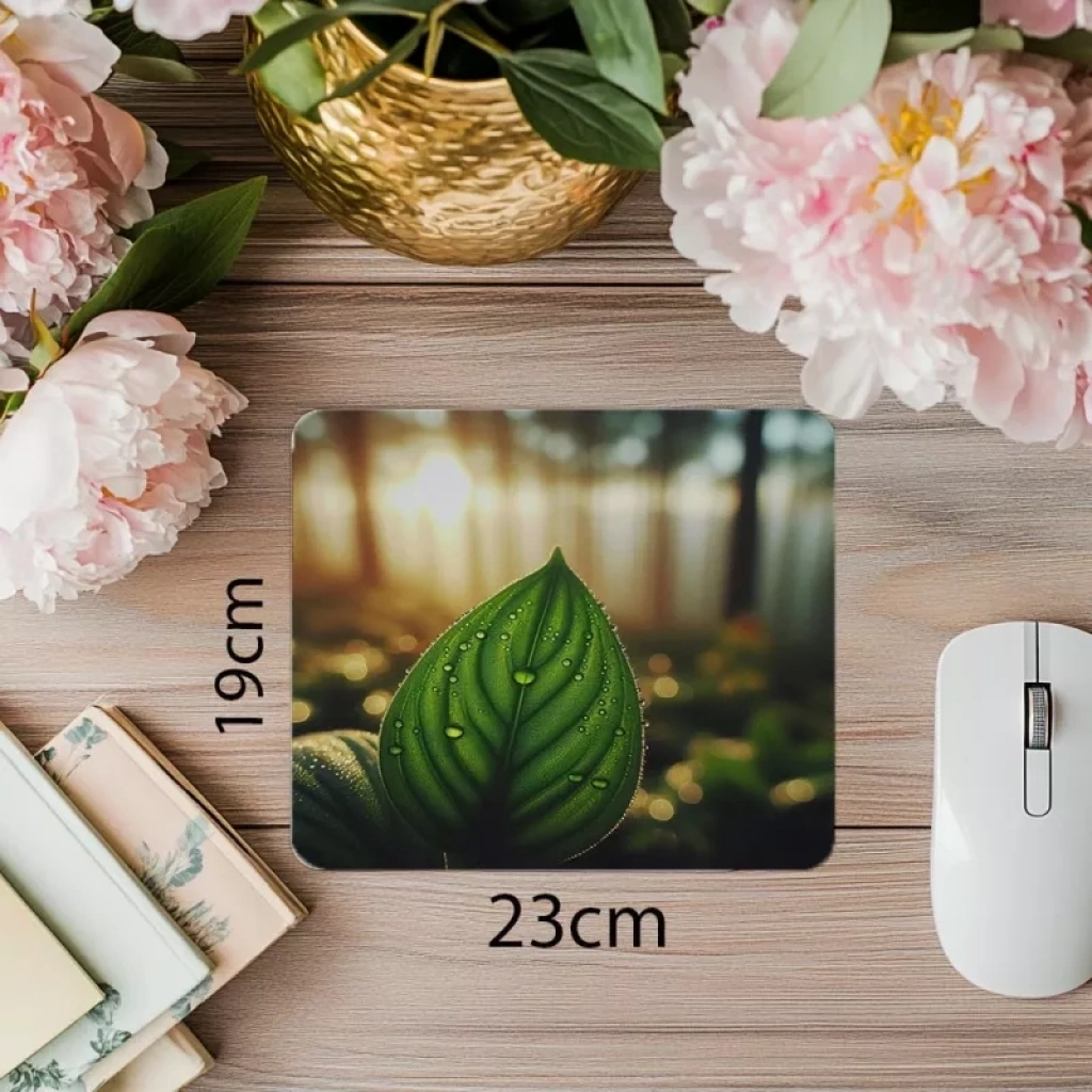 Çiy damlalarıyla parlayan yaprak detayına sahip bu mousepad, doğanın tazeliğini ve zarafetini çalışma alanınıza taşır.