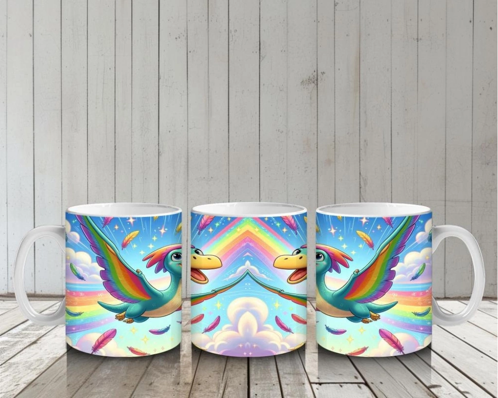 Çocuklara Sütü Sevdiren Gökkuşağı Kanatlı Dino Kuş Kupa Bardak