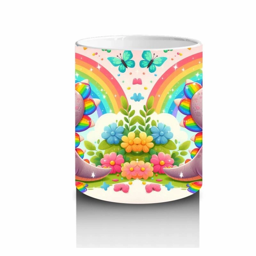 Gökkuşağı şekerleriyle çevrili mutlu bir dinozor… Bu rengârenk tasarım, süt saatini çocuklar için tatlı mı tatlı bir eğlenceye dönüştürüyor.