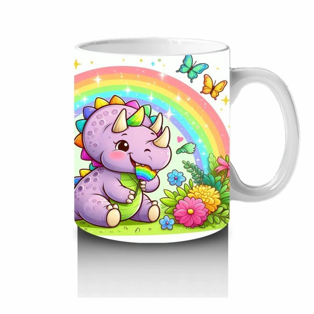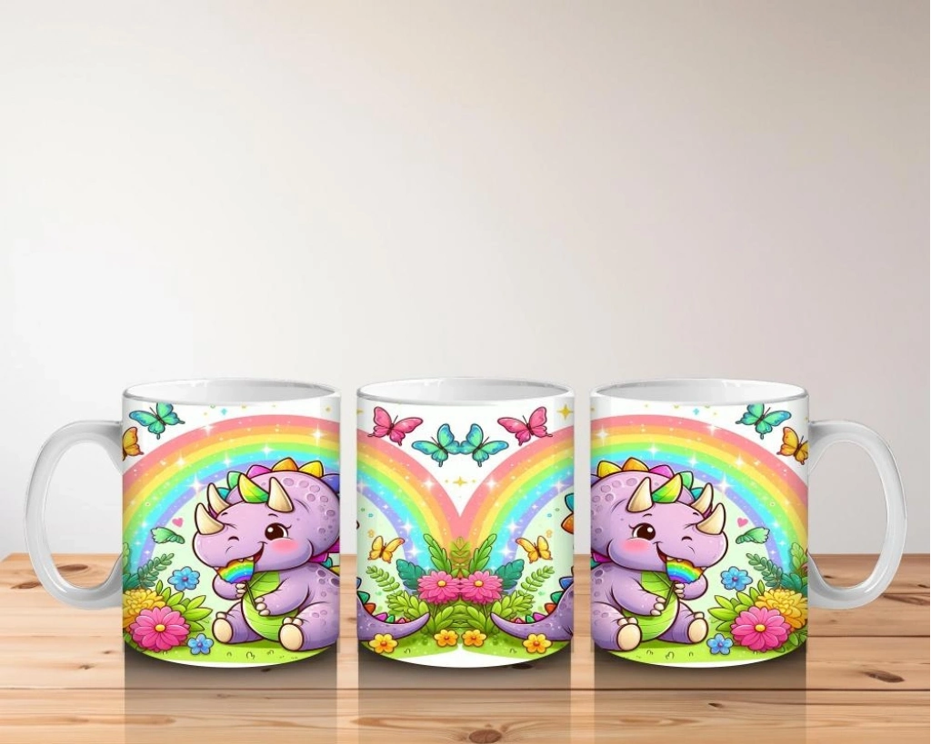 Gökkuşağı renkleriyle süslenmiş şekerler ve gülümseyen bir dinozor… Bu tatlı tasarım, süt saatlerini çocuklar için eğlenceli bir masala çeviriyor.