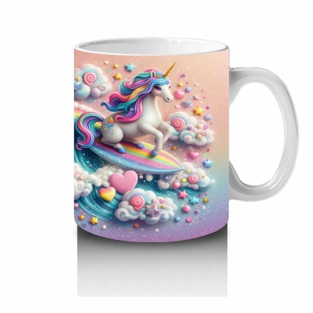 Gökkuşağının dalgalarında sörf yapan eğlenceli bir unicorn… Bu renkli ve enerjik tasarım, süt saatini neşe dolu bir yolculuğa çeviriyor.