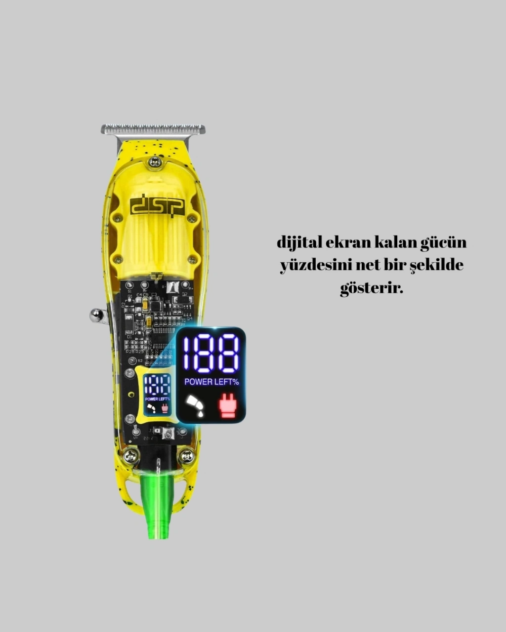 Yalnızca bir saç kesme makinesi değil; aynı zamanda tam kapsamlı bir erkek bakım cihazı. Bu kablosuz model, T şeklinde kesici başlığı ve dijital ekran özellikleriyle geleneksel makinelerden çok daha fazlasını sunuyor. Titanyum alaşımlı T bıçağı, sık ve kalın saçları kolaylıkla keserken, sakal düzeltme işlemlerinde de hassas çizgiler sunar.LED ekran, cihazın kalan pil seviyesini göstererek kesintisiz bir kullanım deneyimi sağlar. USB-C şarj bağlantısı sayesinde çok yönlü şarj imkânı sunar. Yaklaşık 2 saatlik kullanım süresiyle, birden fazla tıraş seansını tek şarjla tamamlayabilirsiniz.3 farklı limit tarağı, kullanıcıya farklı uzunluklarda kesim seçeneği sunar. Tarakları kolayca takıp çıkarabilirsiniz. Cihazın yalnızca 0,1 kg ağırlığında olması, onu taşınabilir kılar. Çantanıza atarak seyahatlerde dahi bakım rutininizi aksatmazsınız.Şeffaf kasası, cihazın tüm iç yapısını görmenizi sağlar. Bu sadece estetik değil; aynı zamanda cihazın durumunu anlamanızı da kolaylaştırır. Düşük titreşimli motor sistemi, gürültüsüz bir çalışma sağlar. Batarya koruma sistemleri, cihazın güvenliğini artırır ve ömrünü uzatır.Profesyonel düzeyde performans, kullanıcı dostu tasarım ve taşınabilir yapı… Bu cihaz, modern erkeklerin ihtiyaç duyduğu her şeyi tek bir gövdede topluyor.