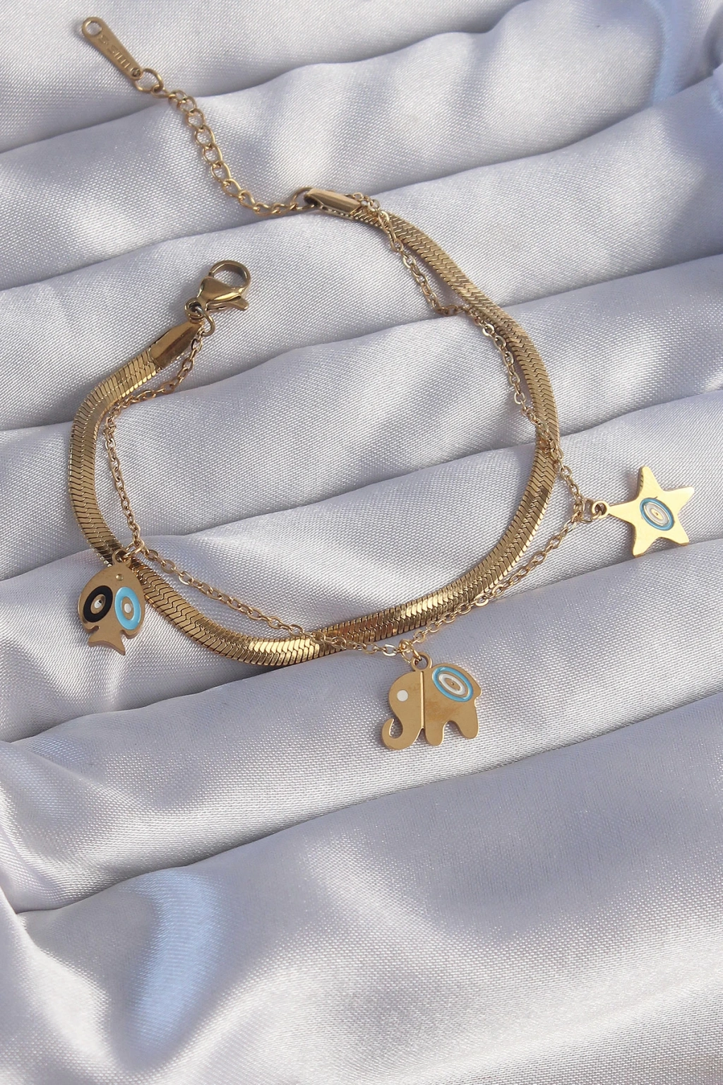 ÇOK SATAN 316L Çelik Gold Renk Çift Zincir Çoklu Aksesuarlı Bileklik