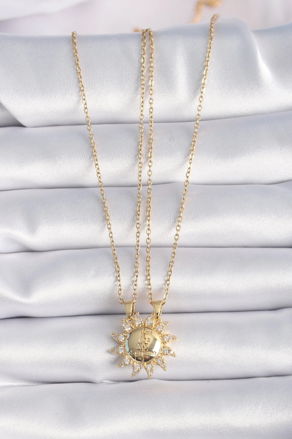 ÇOK SATAN 316L Çelik Gold Renk Zirkon Taşlı Güneş Model İşleme Yazı Detay Arkadaş Kolyesi