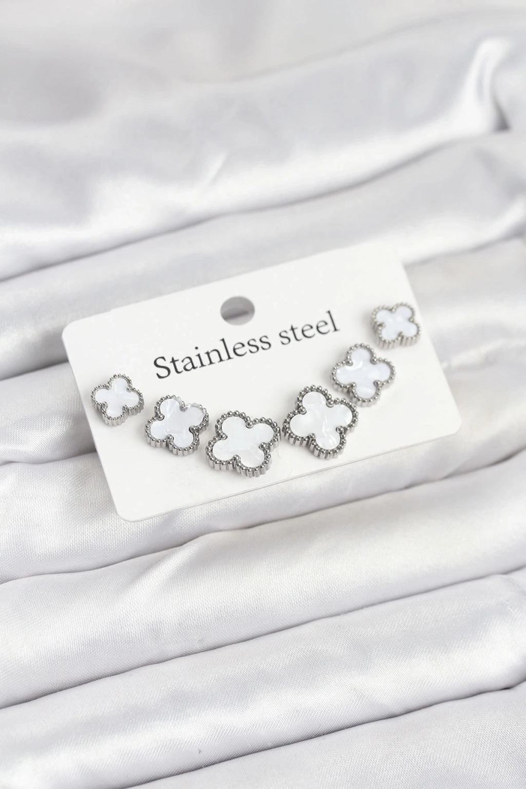 ÇOK SATAN 316L Çelik Gümüş Beyaz Renk 3 Boy Yonca Küpe Seti