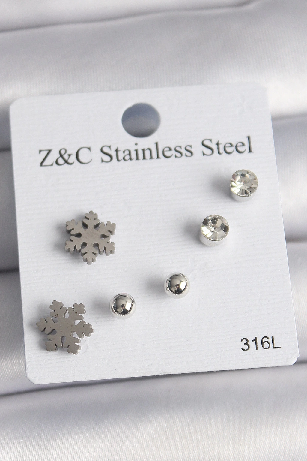 ÇOK SATAN 316L Çelik Gümüş Renk Zirkon Taşlı Kar Tanesi Model Kadın Küpe Seti