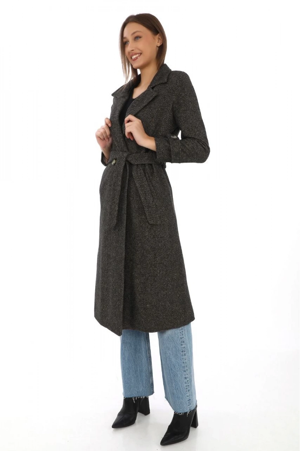 Balık Sırtı Kaşe Kaban – Uzun Boy Kruvaze Yaka Kuşaklı Astarlı Kışlık Tesettür Kaban, Yünlü Dokuma Kaşmir Kumaş, Cepli Rahat Oversize Kalıp Şık Modern Kaban Mont Modeli (Günlük ve Özel Gün Kombinlerine Uygun) - Kahverengi
