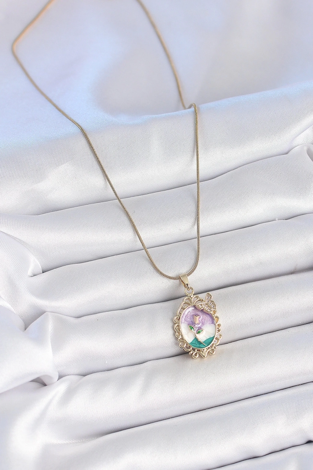 BFS 316L Çelik Gold Renk Zincir Mix Renk Mineli Çiçek İşlemeli Zirkon Taş Detaylı Portre Model Kadın Kolye
